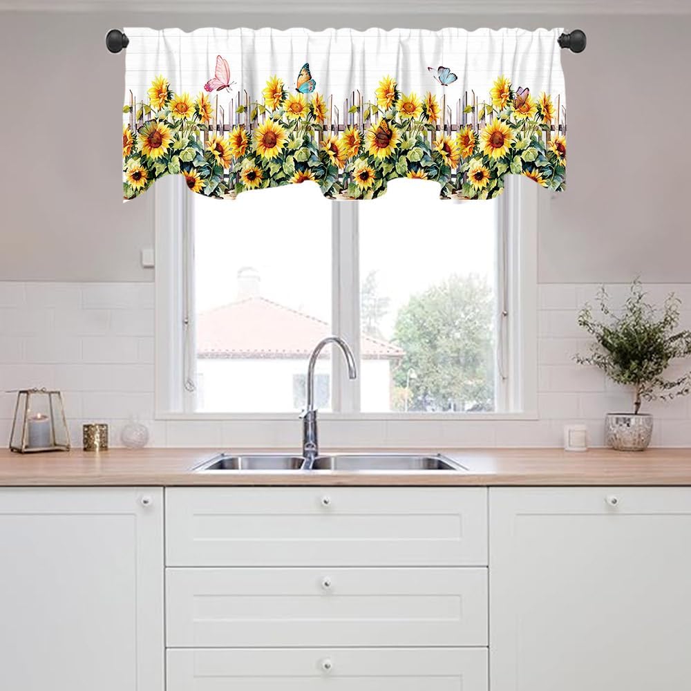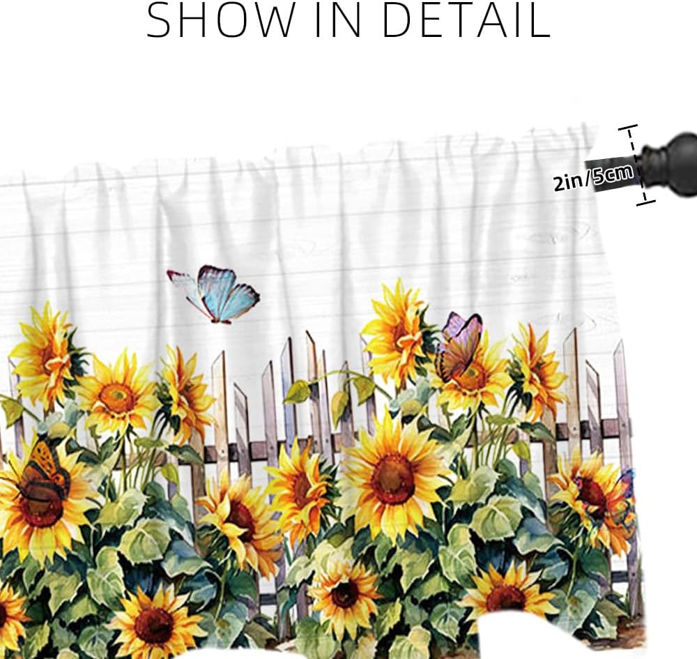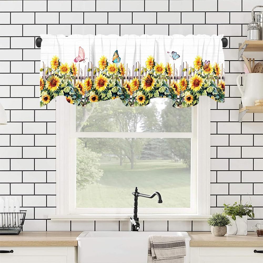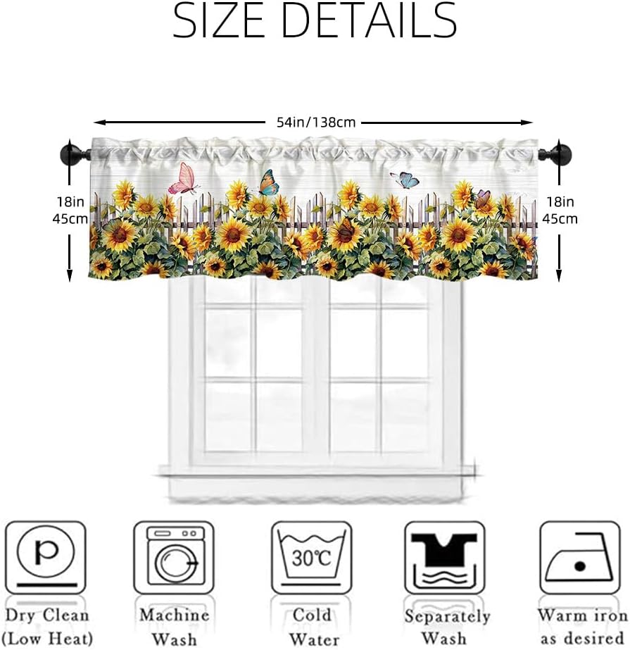 ستارة معالجة نافذة عباد الشمس مقاس 54 × 18 بوصة ريفي ريفي أصفر زهري فراشة أوراق خضراء ستارة نافذة مع جيب قضيب عباد الشمس سياج نافذة ستارة مطبخ ديكور غرفة الطعام