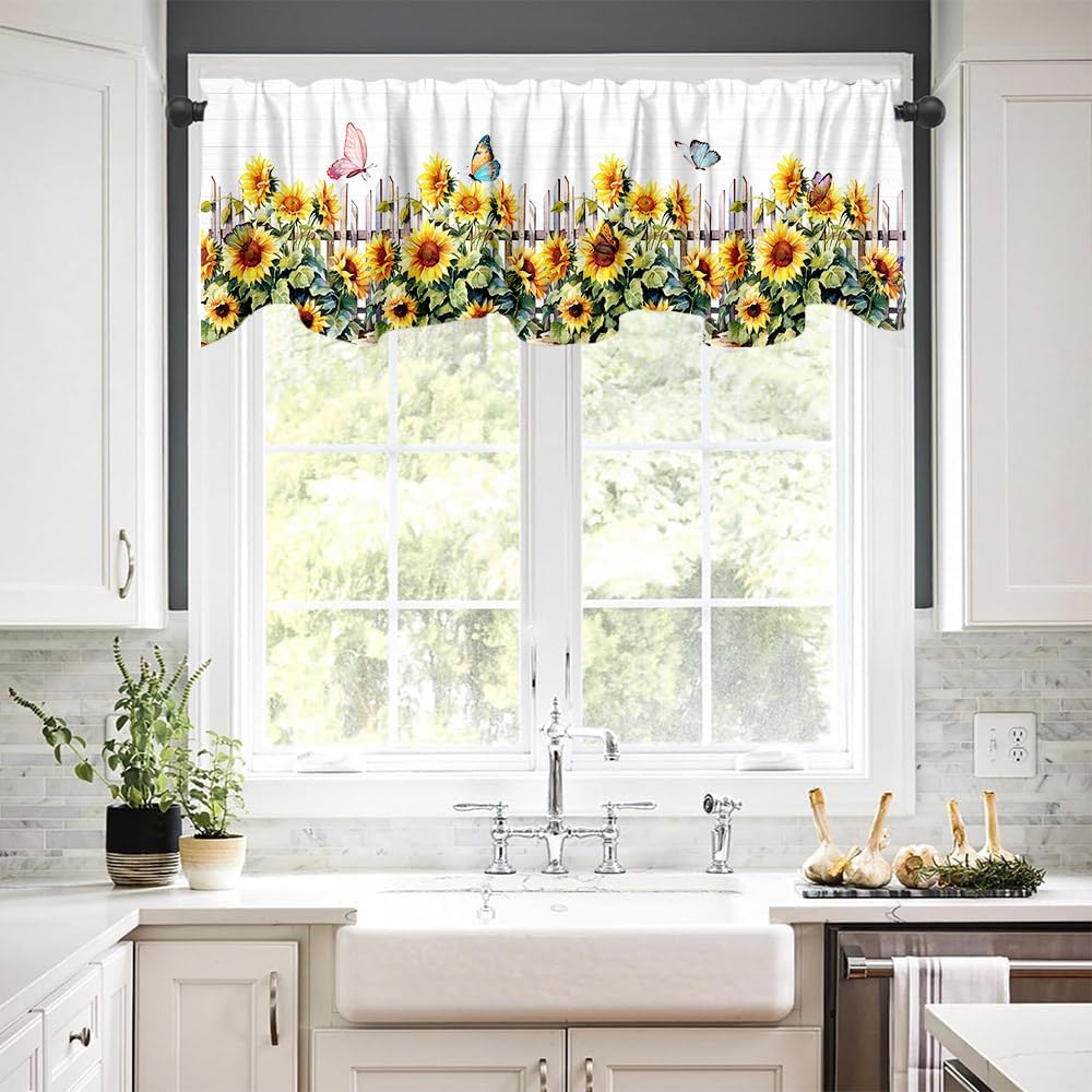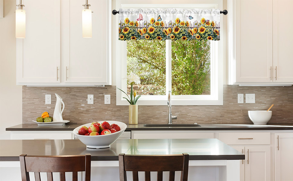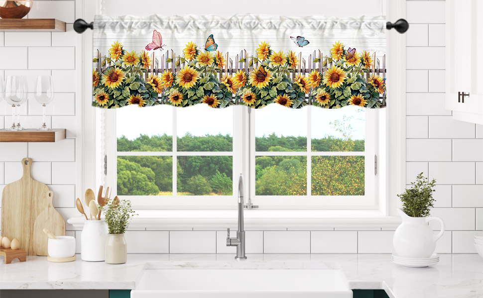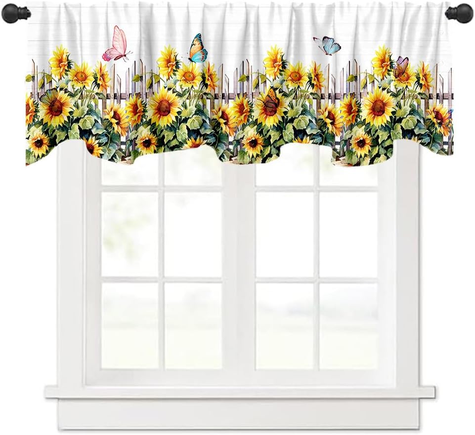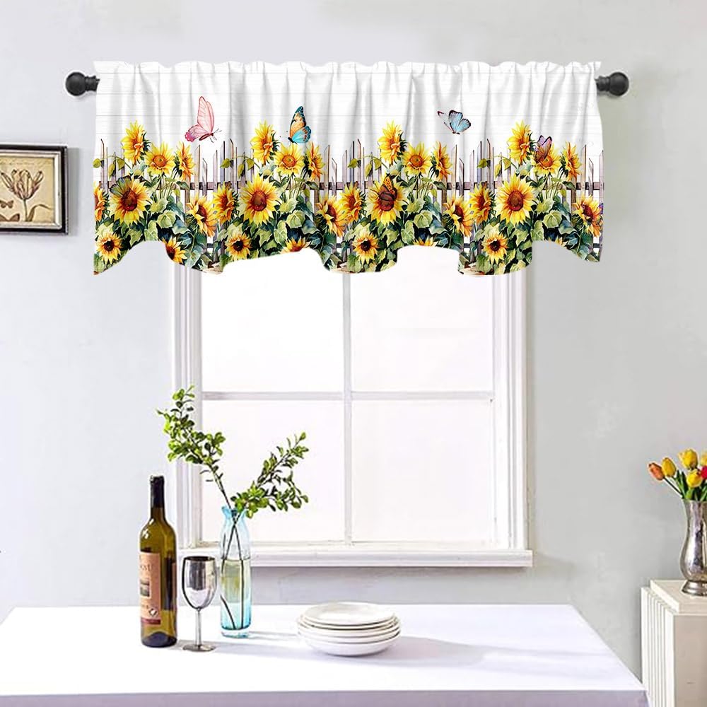 ستارة معالجة نافذة عباد الشمس مقاس 54 × 18 بوصة ريفي ريفي أصفر زهري فراشة أوراق خضراء ستارة نافذة مع جيب قضيب عباد الشمس سياج نافذة ستارة مطبخ ديكور غرفة الطعام
