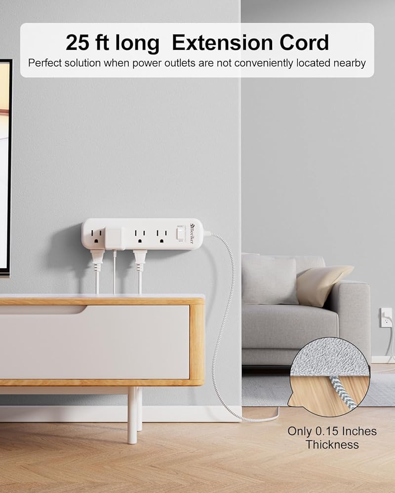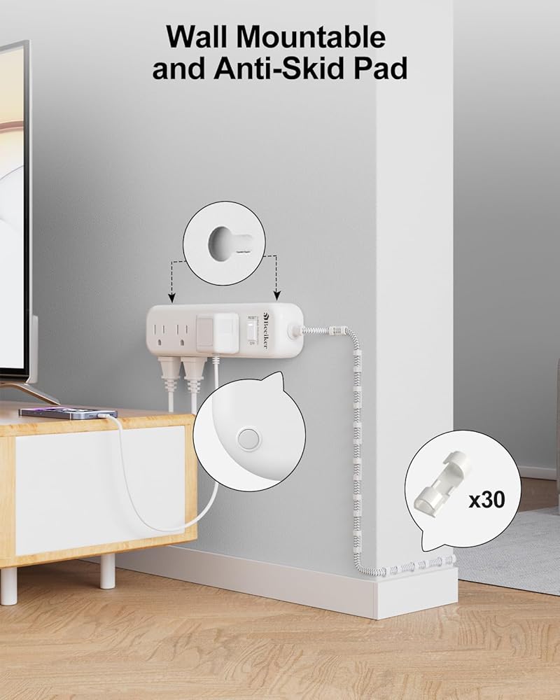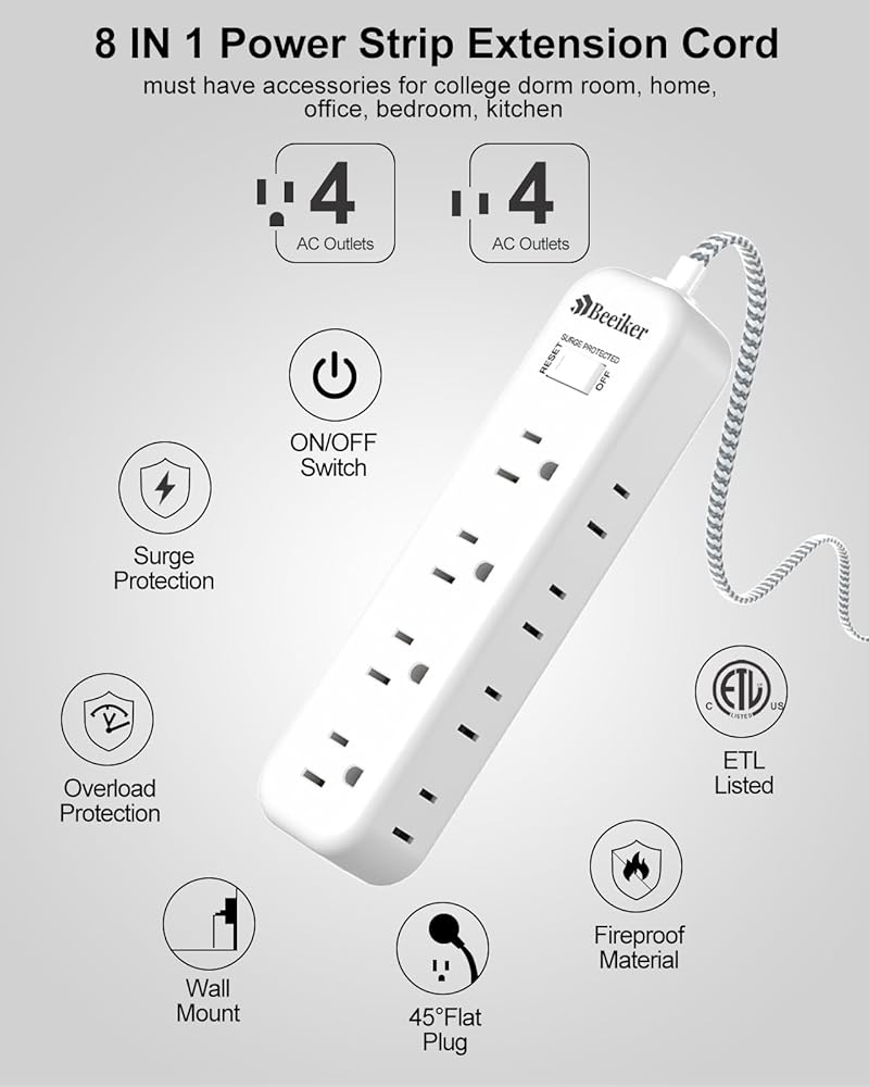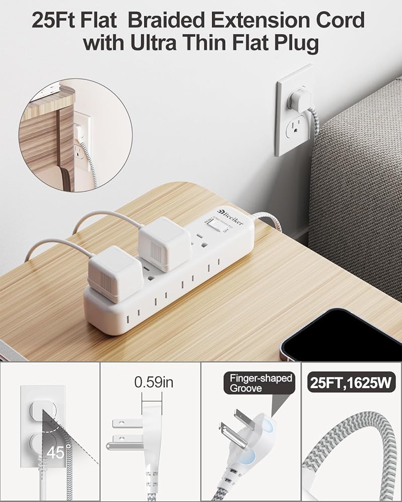 سلك تمديد مسطح بطول 25 قدمًا، قطاع طاقة Beeiker Surge Protector مع 8 منافذ وحماية من التحميل الزائد، سلك تمديد مثبت على الحائط مع منافذ متعددة لغرفة النوم في المنزل والمكتب 13A 1625W 980J ETL