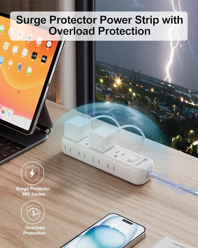 【حماية من زيادة التيار 980 جول وحماية من الحمل الزائد】تصنيف شريط الطاقة الواقي من زيادة التيار 980J للحفاظ على إلكترونياتك وأجهزتك المحمولة محمية من طفرات الجهد الكهربي. مفتاح إعادة ضبط/إيقاف مضاء مع قاطع دائرة متكامل لحماية التحميل الزائد لجميع المنافذ. منظمات وإكسسوارات مكتبية آمنة.