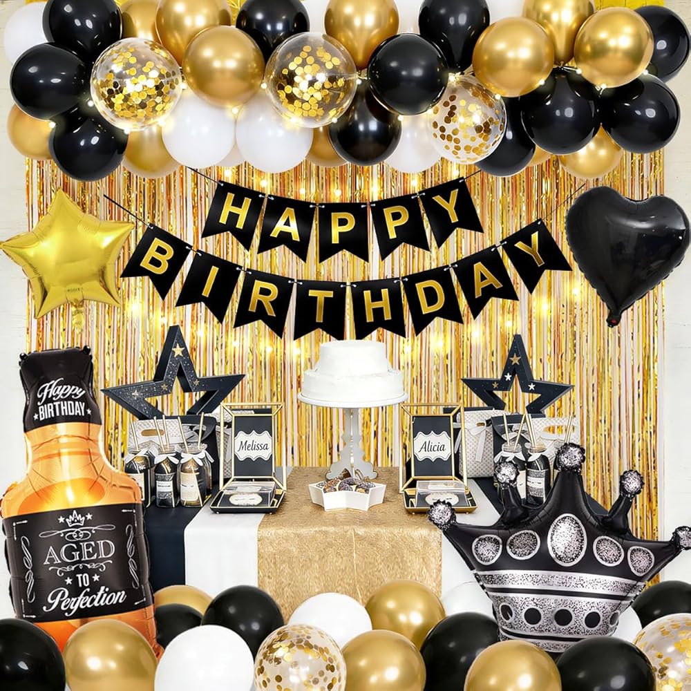 • تشتمل العبوة على قطعة واحدة لافتة عيد ميلاد سعيد، قطعتين من ستائر رقائق معدنية بطول 3.3أقدام × 6.6أقدام، قطعة واحدة من بالون زجاجة ويسكي، قطعة واحدة من بالون التاج الذهبي، قطعة واحدة نجمة بحرية مقاس 18 بوصة، قطعة واحدة قلب ذهبي مقاس 18 بوصة، 40 قطعة بالونات لاتكس مقاس 10 بوصة (كحلي، ذهبي، أبيض)، 5 قطع من بالونات القصاصات مقاس 30.48 سم، قطعة واحدة من مصابيح LED بطول 9.8أقدام، قطعة واحدة من سلسلة البالونات، قطعة واحدة من نقاط الصمغ، قطعة واحدة من المصاصة، قطعة واحدة من الشريط.