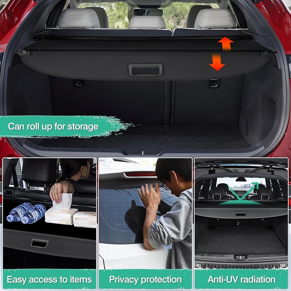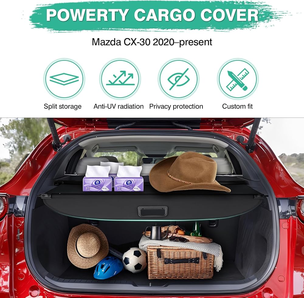 المواد: غطاء صندوق السيارة هذا لسيارة Mazda CX-30 CX30 2024 2023 2022 2021 2020 مصنوع من سبائك الألومنيوم السميكة والبولي فينيل كلوريد المقاوم للماء، مما يضمن عدم القدرة على الحركة والمتانة.