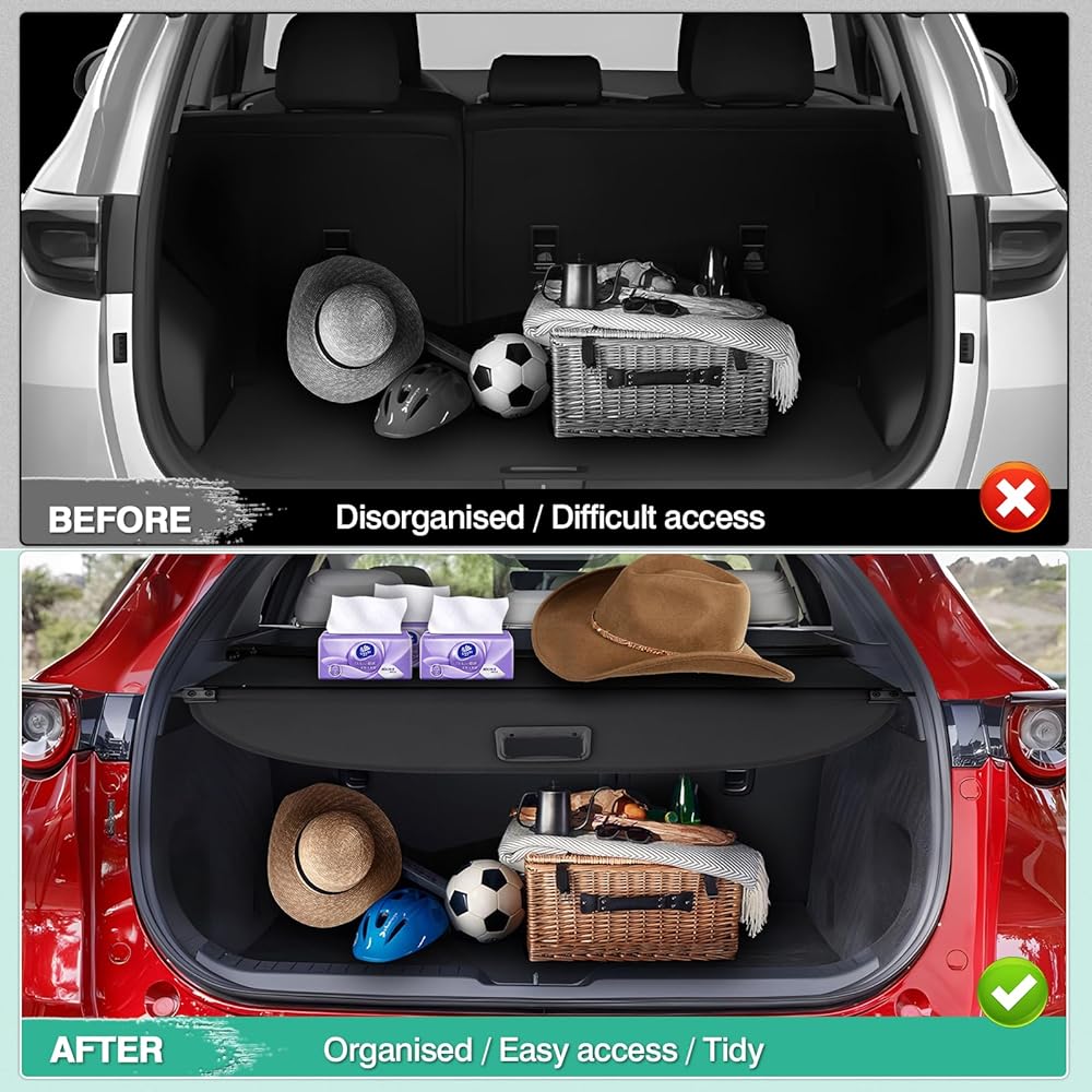 الإعداد: تم تخصيص غطاء البضائع هذا لمازدا CX-30 CX30 2020 2021 2022 2023 2024. تم تصميم غطاء صندوق السيارة وفقًا لراديان صندوق السيارة الأصلي، فهو يناسب الجسم تمامًا.