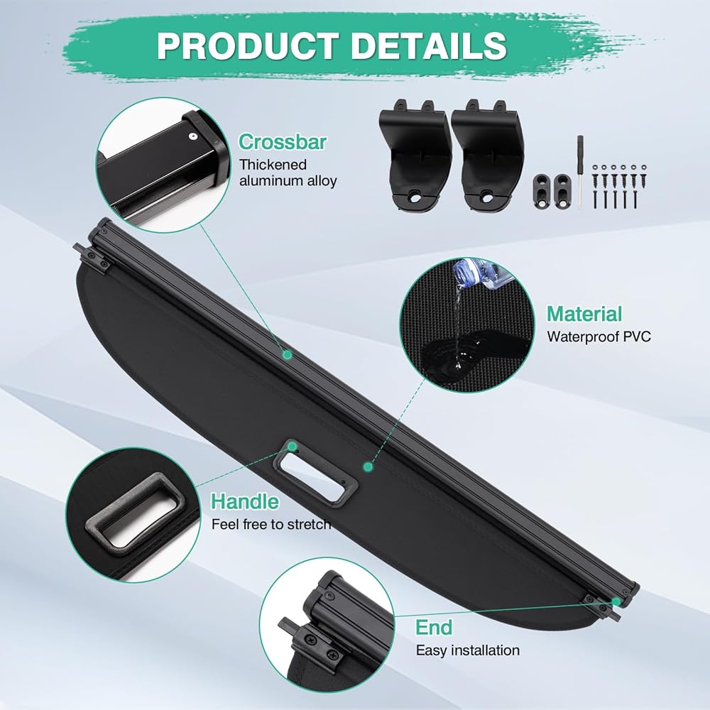 الوظائف: يمكن لغطاء صندوق السيارة الخلفي هذا حماية العناصر الموجودة في صندوق السيارة من الأشعة فوق البنفسجية؛ سوف يحافظ غطاء الحمولة الخاص بنا على المتعلقات الخاصة بعيدًا عن أعين المتطفلين؛ يعمل غطاء صندوق السيارة على تحسين استخدام المساحة.