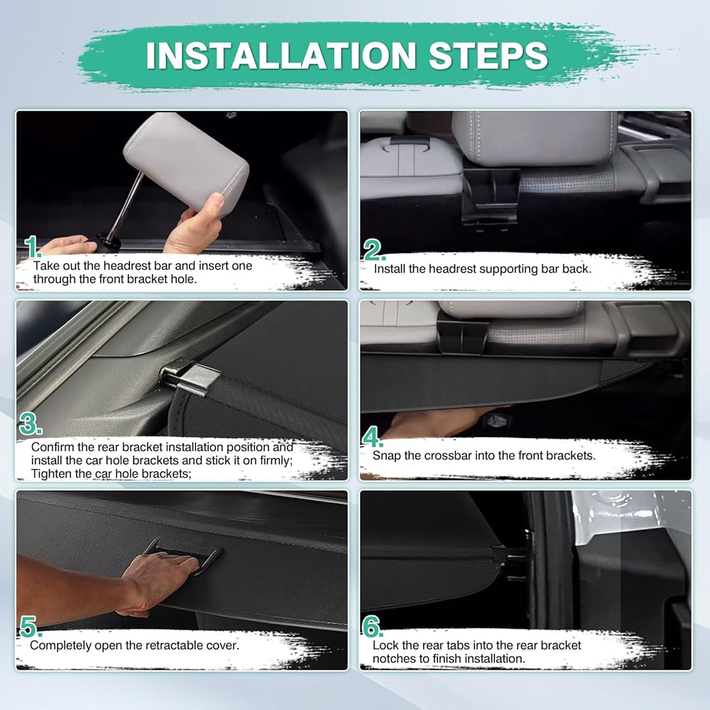 سهل التركيب: يأتي غطاء الحمولة هذا مع 4 دعامات تثبيت، سهل التركيب. قم بإزالة مسند الرأس وقم بتمرير القضيب من خلال فتحة الدعامة الأمامية؛ ضع مسند الرأس مرة أخرى واستخدم مفك براغي لشد البراغي؛ تأكد من وضع تركيب الدعامة الخلفية و قم بتثبيت دعامات فتحة السيارة، وشد دعامات فتحة السيارة، ثم قم بتثبيت العارضة على الدعامتين الأماميتين، وافتح الغطاء وأغلق الألسنة الخلفية في الشقوق الموجودة على الأقواس الخلفية لإنهاء التثبيت.