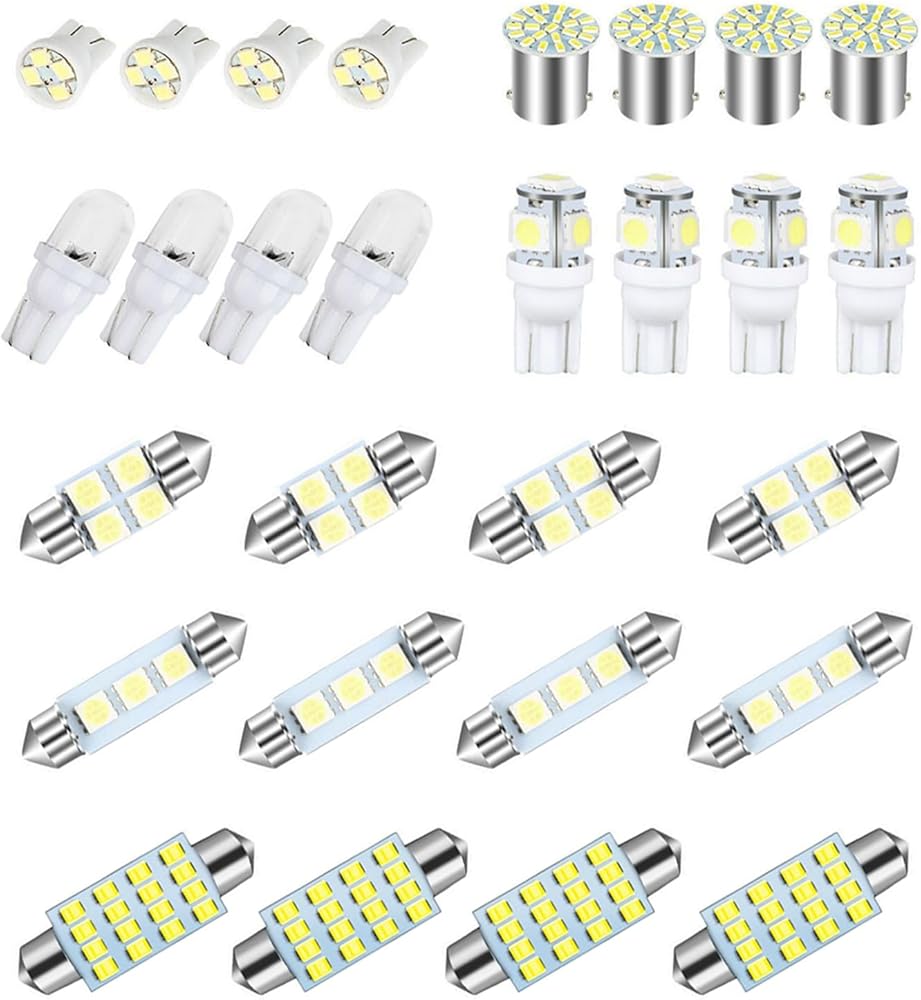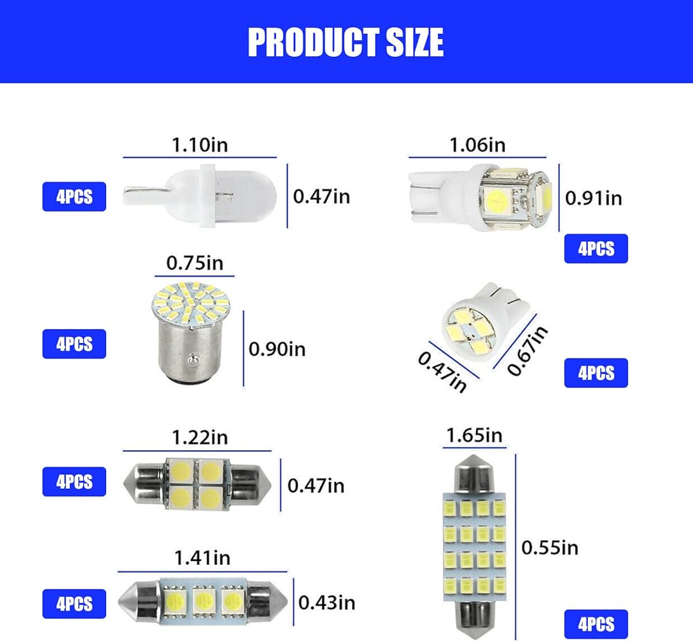 Packing List: You will receive a full set of 28 replacement bulbs, including 4 T10 1SMD lens, 4 T10 1210 4SMD lamps, 4 T10 5050 5 lamps, 4 bi-tip 31mm 5050 4SMD lamps, 4 bi-tip 41mm 1210 16 lamps, 4pcs 36mm 5050 3SMD, 4pcs 1157 1206 22SMD lamps.