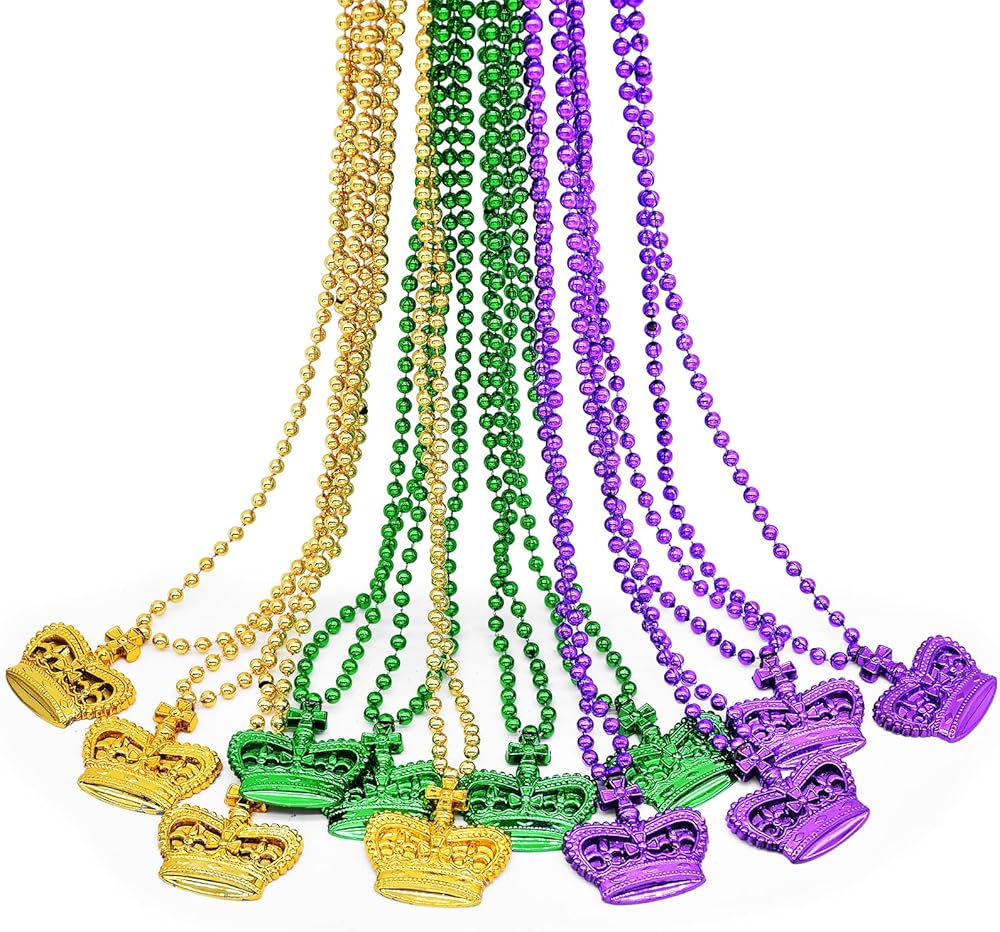 قلادة خرز ماردي جراس - تحتوي هذه الحزمة على 12 قطعة من قلادات خرز ماردي جراس مقاس 33 بوصة تتميز بمزيج ملون من اللون الأرجواني والذهبي والأخضر.