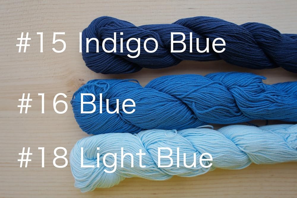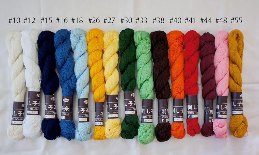A skein of thread, 145 meter (about 475 feet) long, with the supreme quality for the Sashiko purpose. 6 of thin embroidery floss is twisted in unique way to make thick and rich thread. They will results in beautiful stitches on the fabric. Made in Japan Made of Egyptian Cotton 100% 145 meter (about 475 feet) / per skein We have 15 selection of mono colors, dyed with synthetic dyes. #10 – Original White, #12 – Bleached White, #15 – Indigo Blue, #16 – Blue, #18 – Light Blue, #26 – Yellow, #27 – Light Yellow, #30 – Green, #33 – Light Green, #38 – Dark Brown, #40 – Orange, #41 – Red, #44 – Red Brown, #48 – Pink, #55 – Gold / Ocher