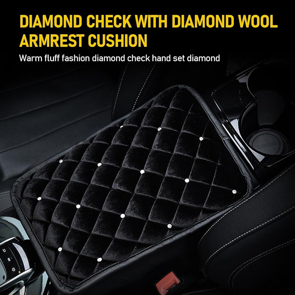 Hawyet 1 PC Universal Plush Center Console Armrest Pad, 8.26" x 11.41" Fashion Diamond Diamond Car Armrest Box Mat, Elbow Protection Comfort Fleece, Suitable for Most Car Models (Black)