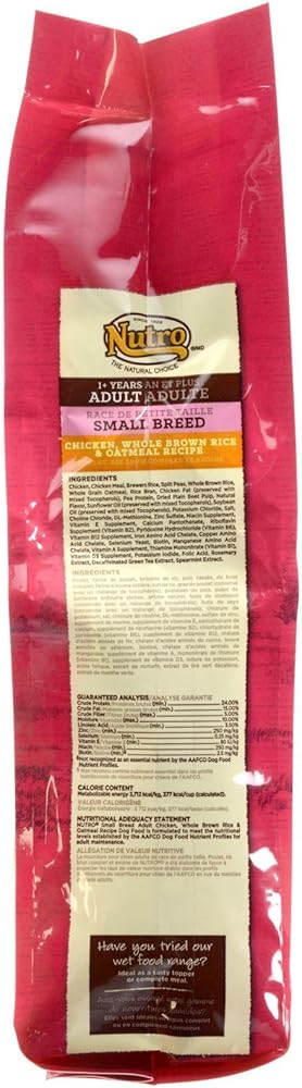 NUTRO WHOLESOME ESSENTIALS Small Breed Adult Farm Raised Chicken, Brown Rice and Sweet Potato Recipe Dog Food always starts with great tasting, farm raised chicken and contains a unique blend of whole grains, vegetables and fruit. This natural dog food provides natural fiber for healthy digestion and essential antioxidants, such as vitamin E, for a healthy immune system, plus vitamins, minerals and other nutrients. These recipes are specifically tailored to meet your small breeds unique needs, and contain Omega 3 and 6 fatty acids, to promote healthy skin and a soft, shiny coat. NUTRO Food for Dogs follows the THE NUTRO FEED CLEAN philosophy, is always made with Non GMO Ingredients and is made with no artificial flavors, colors or preservatives.