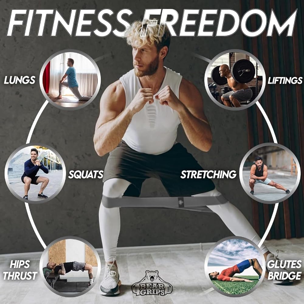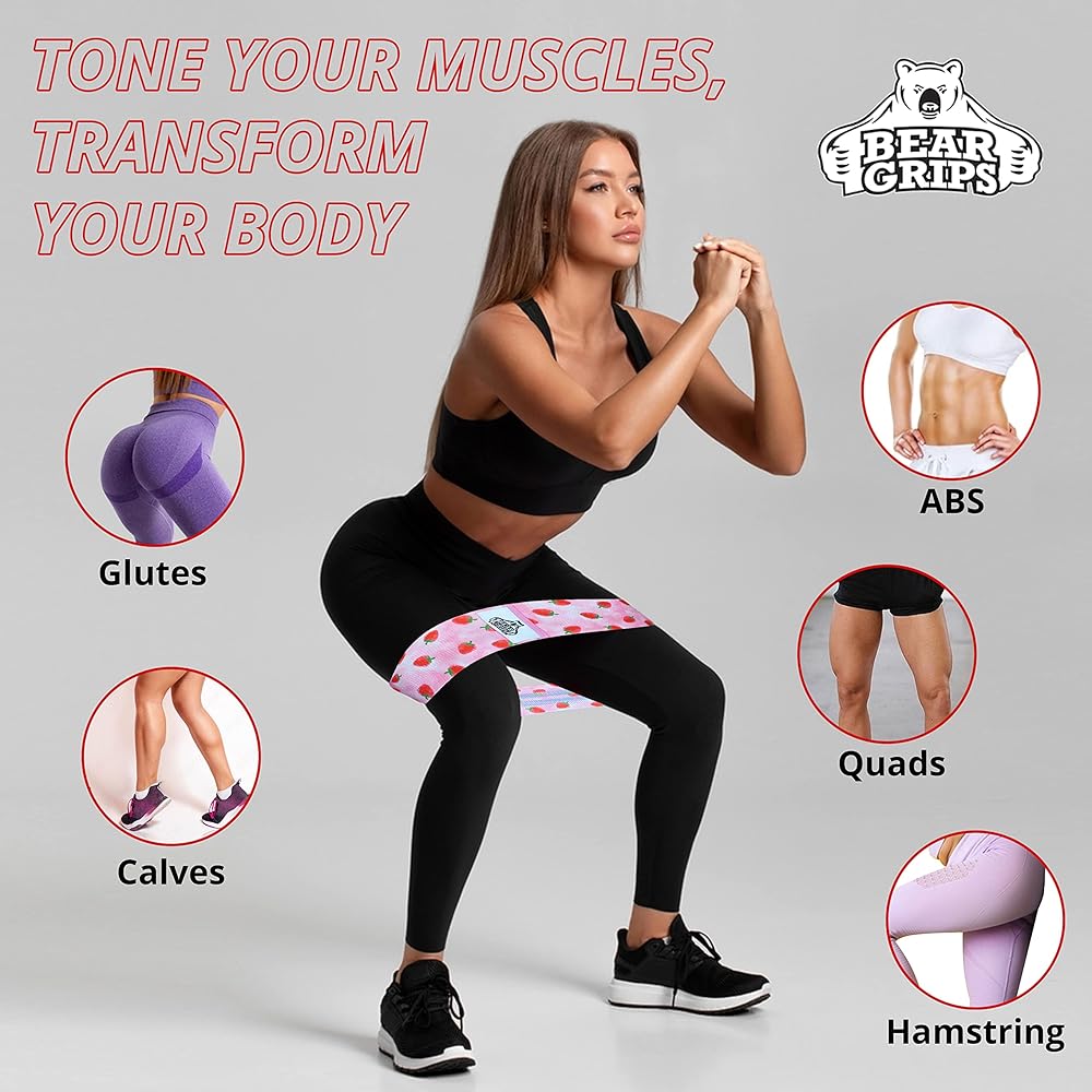 𝐃𝐔𝐑𝐀𝐁𝐋𝐄 𝐂𝐎𝐍𝐒𝐓𝐑𝐔𝐂𝐓𝐈𝐎𝐍𝐒 𝐅𝐎𝐑 𝐒𝐓𝐀𝐁𝐈𝐋𝐈𝐓𝐘: Bear Grips thigh bands for workout are made from top-tier elastic cotton and boast a non-slip inner layer for stability. Our exercise equipment for home workouts is designed for a seamless workout as they won't roll up or pinch. The anti-slip elastic line of this fabric resistance band stays put during any activity. This workout bands resistance for women elasticity endures, assuring heightened resistance for sustained progress