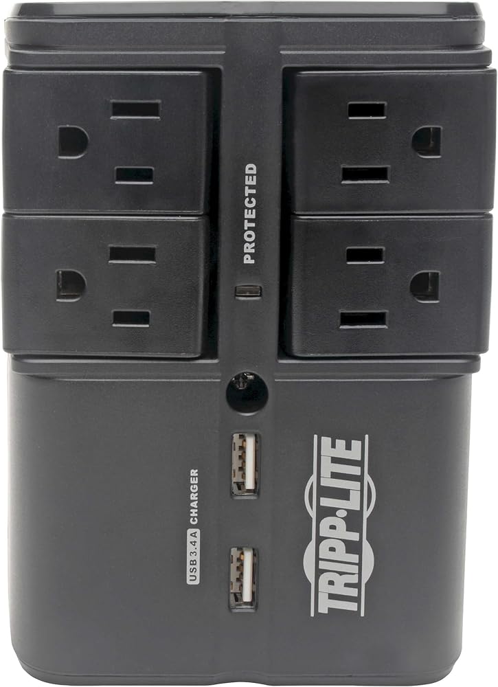 Key Features 4 rotatable outlets/direct plug-in Surge suppression rating: 1080 joules 3.4 amp USB Charger EMI/RFI noise filtering Diagnostic LED indicates Protected (green)