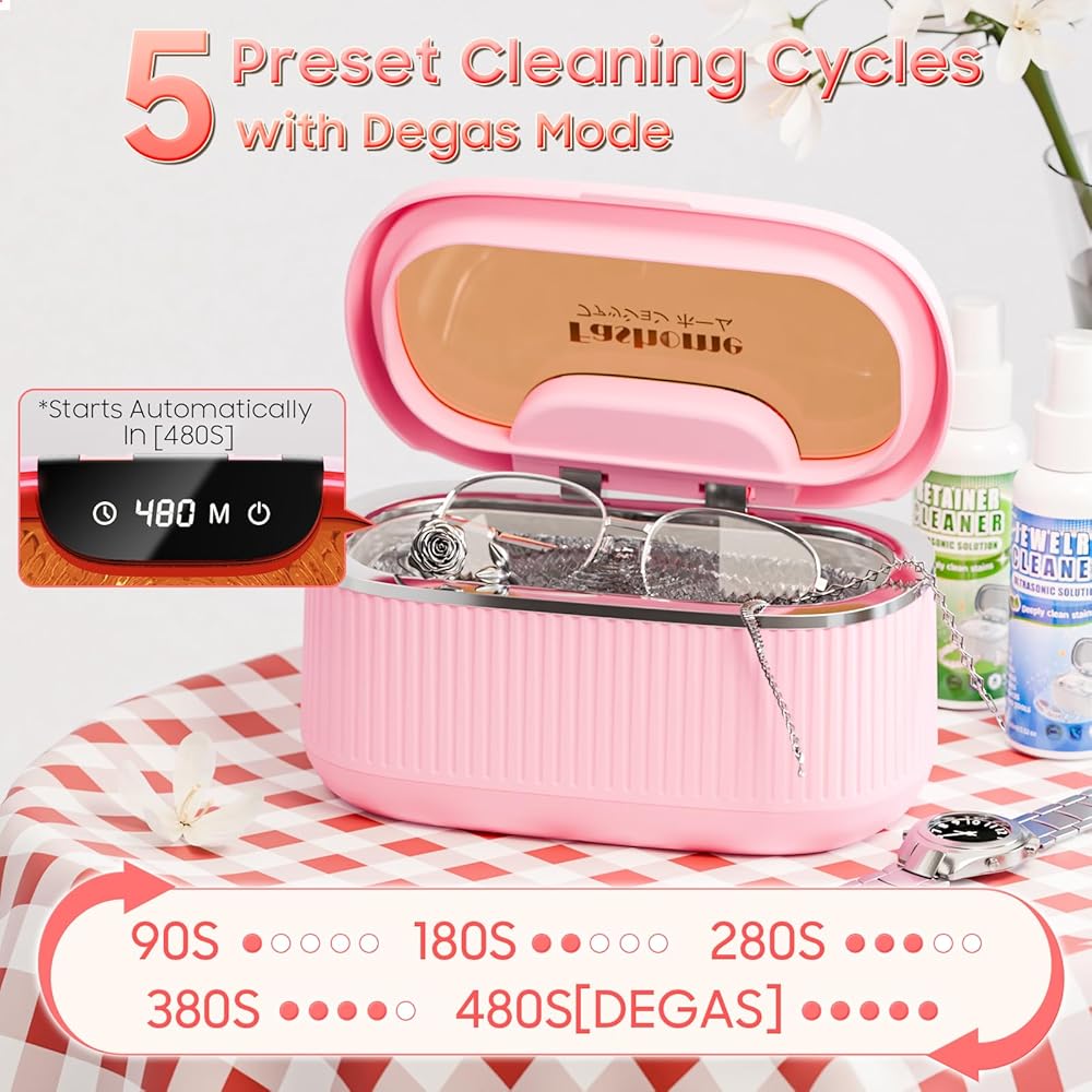 ⏰[5 Digital Timer and Degas]: In this jewelry cleaner ultrasonic machine with digital timer and degassing function, you can select from 5 pre-set settings cleaning cycles (90-180-280-380-480 seconds), and it will countdown the time on the digital display and auto shut off when finished. When you choose 480s cleaning mode, the degassing function of this jewelry cleaner ultrasonic machine will auto-operate to separate the oxygen produced during and improve the cleaning effect.