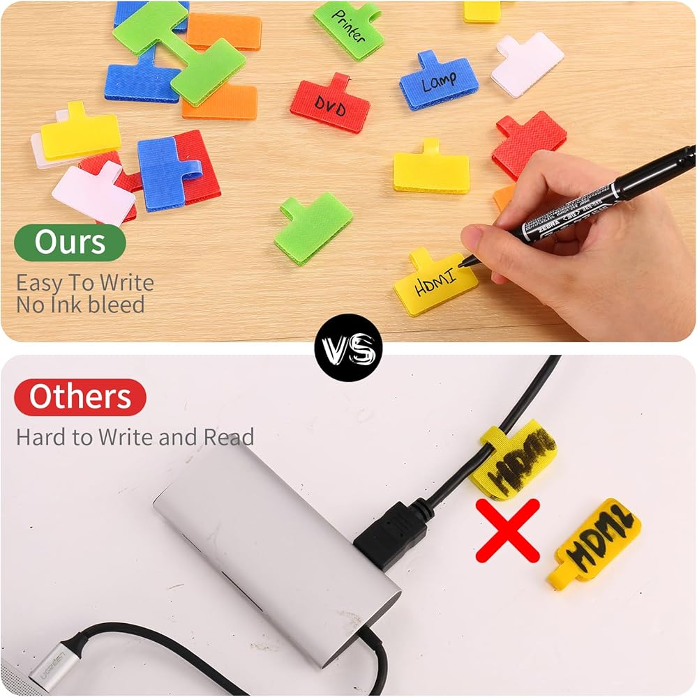 • ✅【Easy To Write On】- What makes these cable labels different from other brands is that they don't bleed ink- you can write on the surface of cable tags with a marker, pen, or ink pen, clearly without any blur vision.