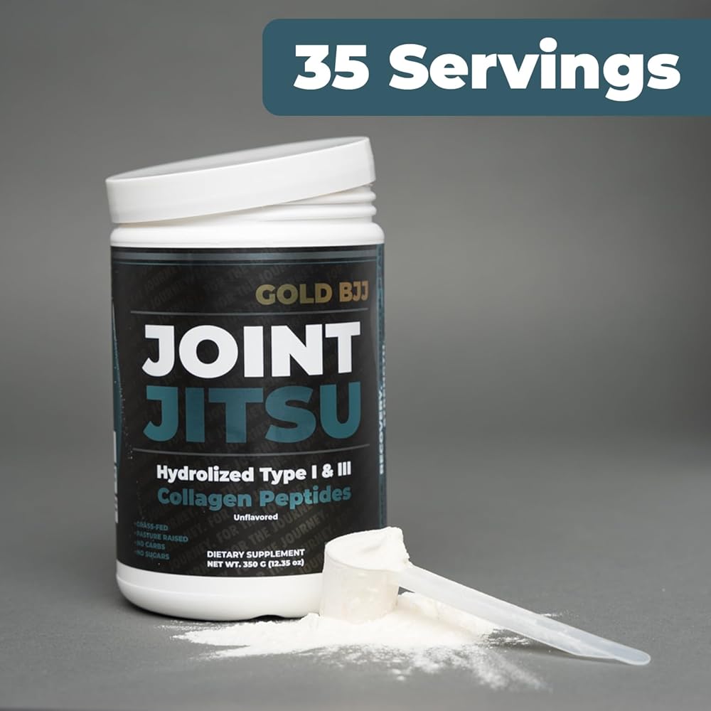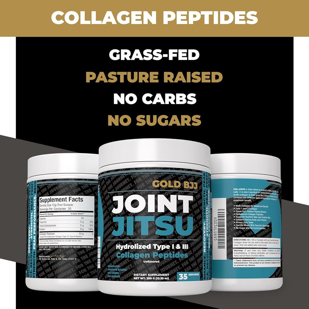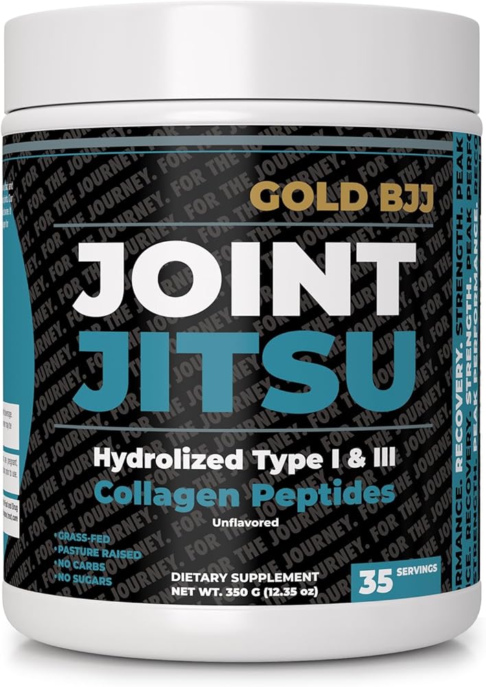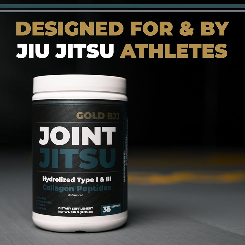 Elevate your game with Gold BJJ Joint Jitsu - the trusted companion for every Jiu Jitsu athlete seeking optimal joint health. With the rigorous demands of Jiu Jitsu on the joints, ensuring their peak health becomes paramount. Joint Jitsu is the answer. Our formula harnesses the benefits of hydrolized type I and III collagen peptides, renowned for their role in fostering joint flexibility, mobility, and an enhanced range of motion. Without the baggage of sugars or carbs, and with an absolutely neutral taste, it easily integrates into any fitness regimen. Contains hydrolized type I and III collagen peptides, offering targeted support for your joints. Free from sugars and carbs, making it a clean addition to your daily intake. Completely tasteless, it can be seamlessly blended into your drinks without altering their flavor. Collagen is scientifically recognized to bolster overall joint health, significantly enhancing flexibility and mobility. Tailored for the unique demands of Jiu Jitsu athletes, underlining its importance for performance. Jiu jitsu demands the best from you, and with Gold BJJ Joint Jitsu, you're equipped to give just that. Prioritize your joint health and feel the difference in every roll and movement.