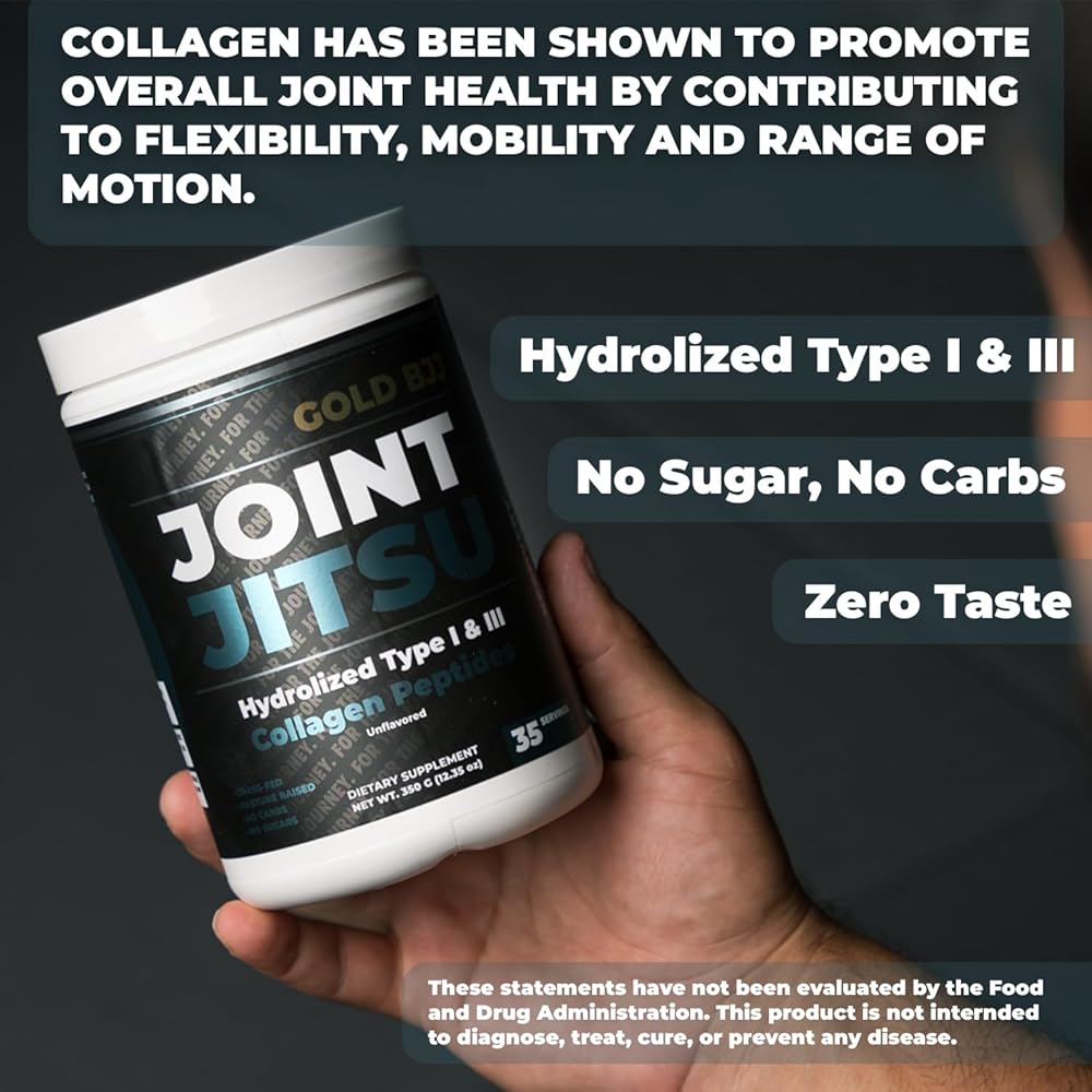 • PROTECT YOUR JOINTS 🦴 With Gold BJJ's "Joint Jitsu" hydrolized collagen peptides. Collagen has been shown to promote overall joint health by contributing to flexibility and range of motion.