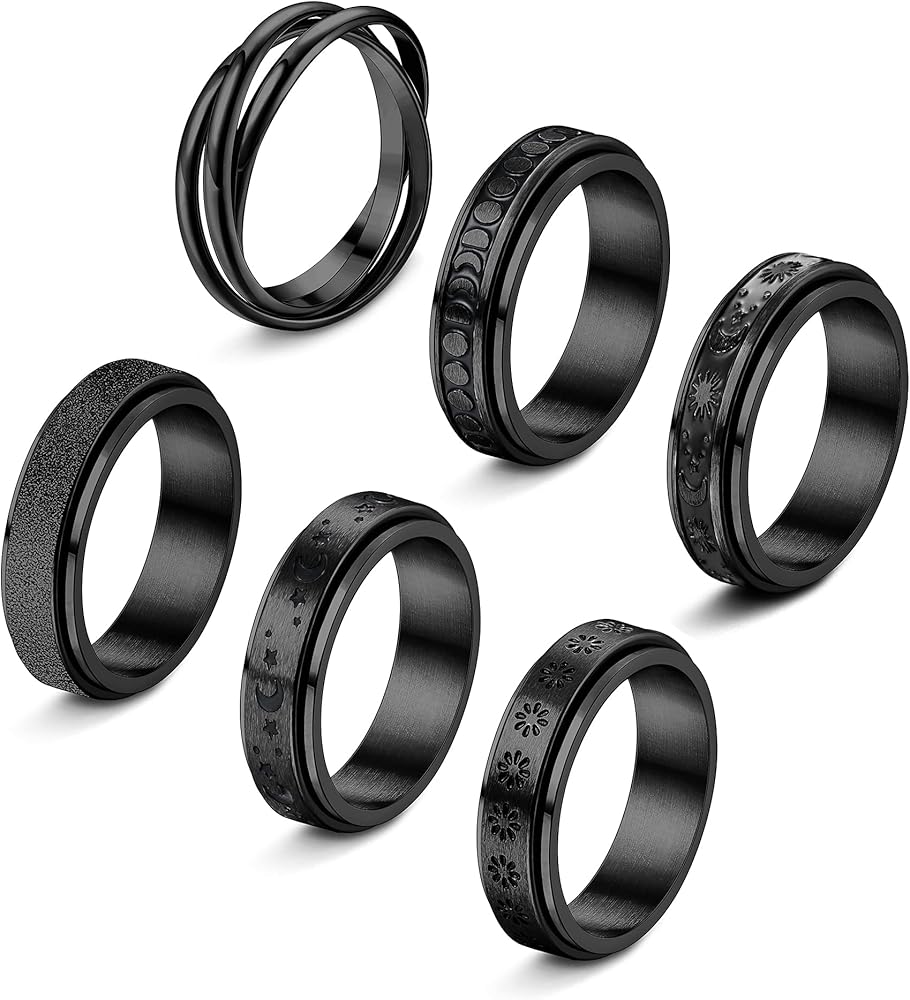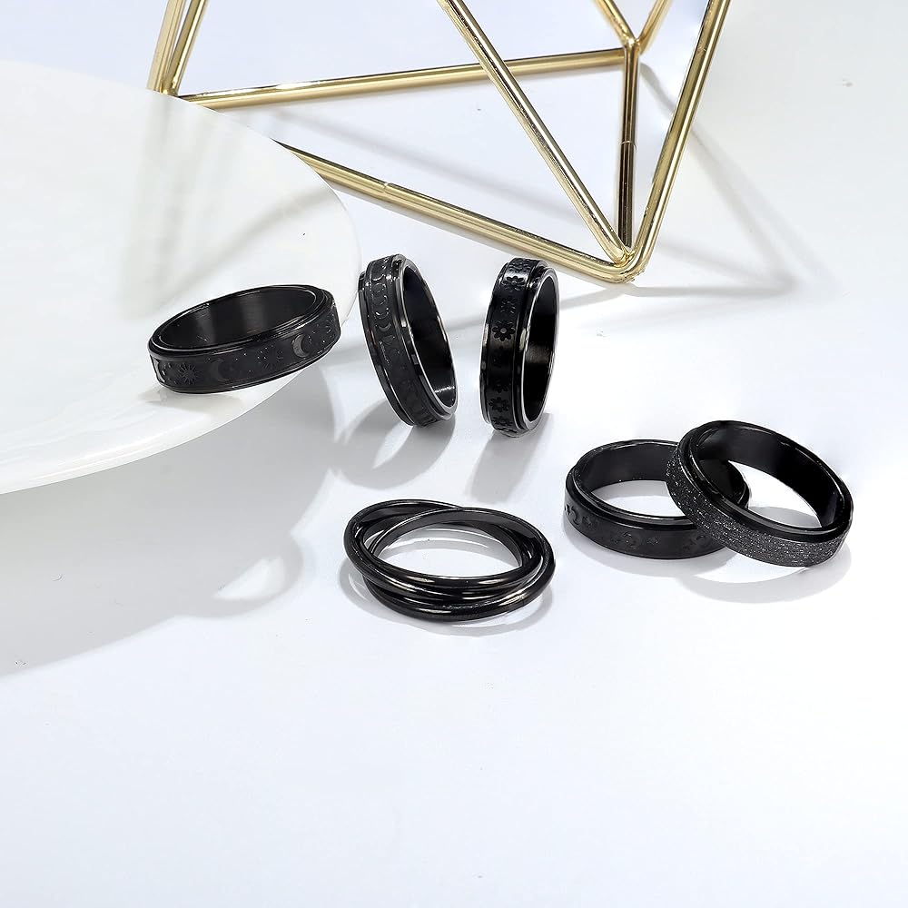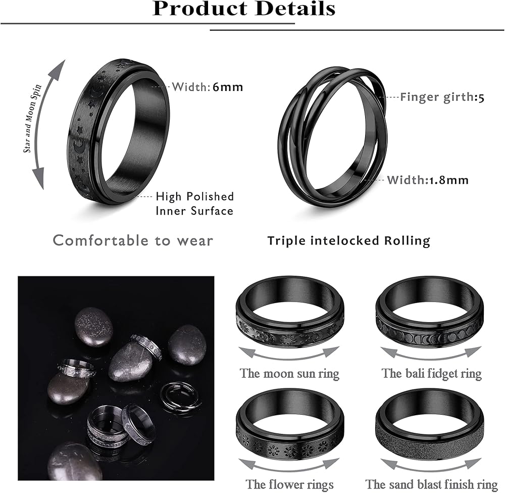 مجموعة حلقات دوارة رائعة - تأتي العديد من حلقات الفرقة الرائعة في مجموعة، قطعتان مختلفتان من حلقات تململ نجمة القمر، قطعة واحدة من حلقة دوارة عالية التلميع ثلاثية متشابكة، قطعة واحدة من حلقة تخفيف التوتر على شكل شريط زهور، قطعة واحدة من حلقة اللمسة النهائية لتفجير الرمال وقطعة واحدة من حلقة مرحلة القمر . تتوفر مقاسات حلقات فيدجيت باند 5/6/7/8/9/10؛ نمط متعدد يمنحك اختيارات متعددة للارتداء كل يوم.