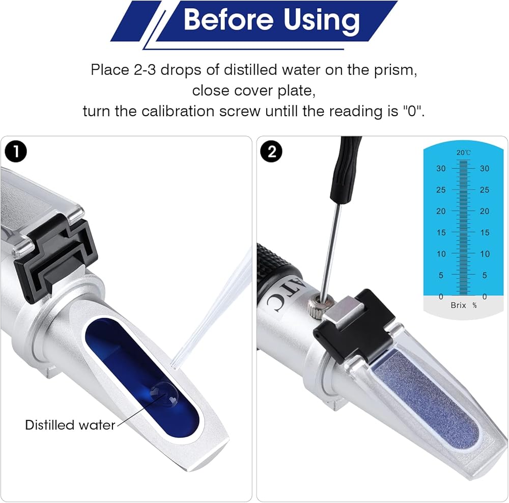 【Packing List】1 x refractometer; 1x calibration screwdriver; 1 x pipette; 1 x instruction manual; 1 x cleaning cloth and a free hard case included which make the brix refractometer meter convenient to store or carry around.