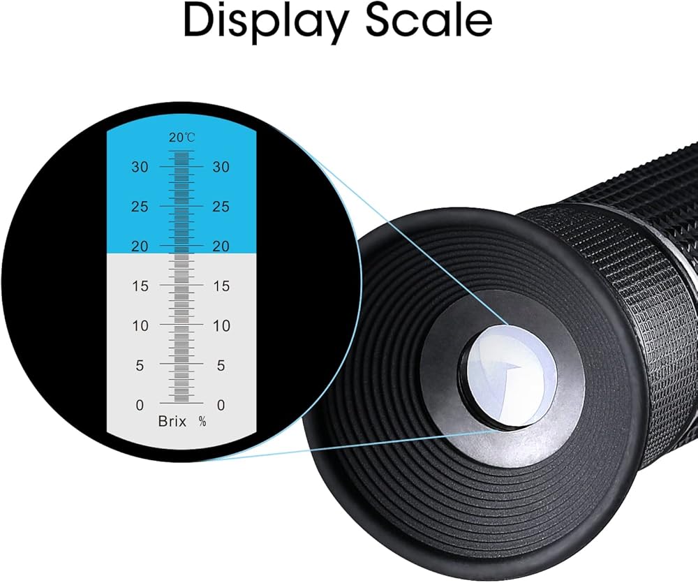 【Easy to Use】Place 2 - 3 drops of liquid sample onto the prism of this brix refractometer, then look through the eyepiece to get the reading directly. NO test jars needed, NO measuring and calculating work needed, operating easily, convenient to use and save your time.