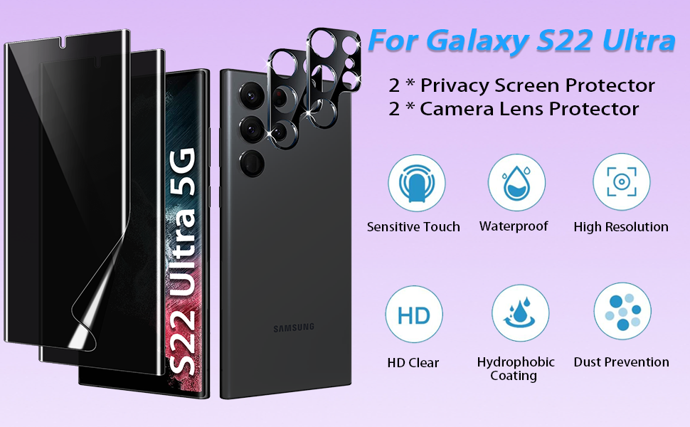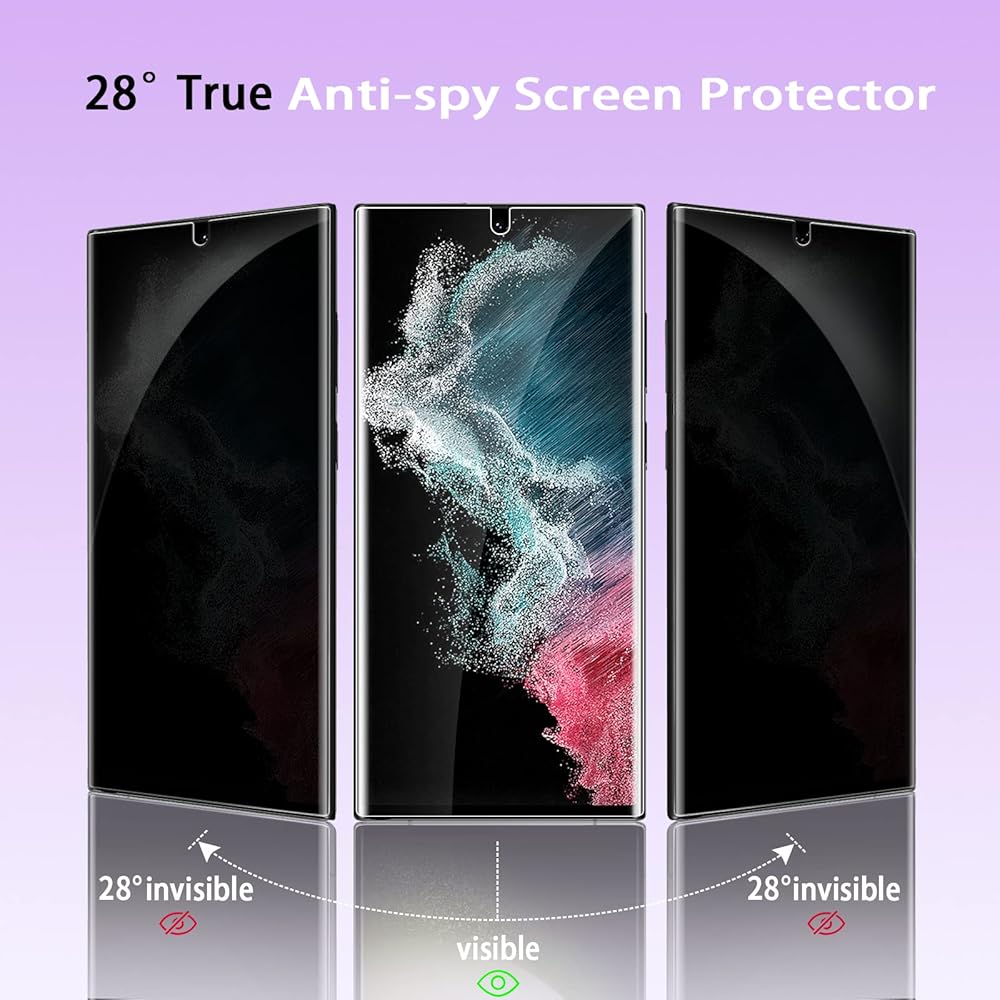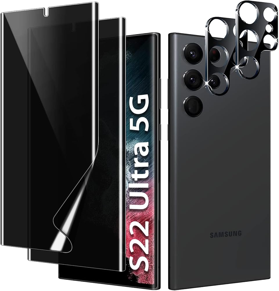 【Samsung Galaxy S22 Ultra 5G】 عبوتان من واقي شاشة الخصوصية فائق المرونة لهاتف Samsung Galaxy S22 + عبوتان من واقي عدسة الكاميرا. واقي الشاشة متوافق فقط مع هاتف Samsung Galaxy S22 Ultra مقاس 6.8 بوصة. يمكنك مشاهدة فيديو التثبيت قبل تثبيت واقي الشاشة.