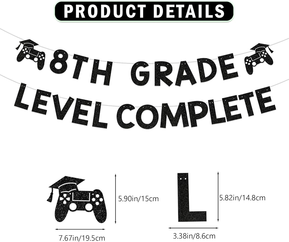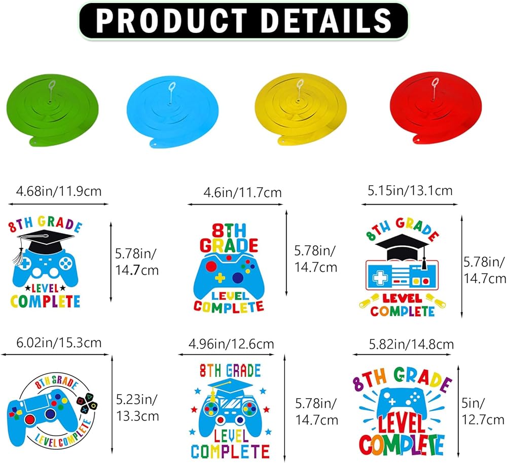 تشمل العبوة: 1 × لافتة كاملة من مستوى الصف الثامن، وديكورات معلقة للتخرج من الدرجة الثامنة × 12. يوجد 6 قطع ورقية بتصميمات مختلفة؛ 6 قطع من رقائق الفويل المعلقة بألوان مختلفة.