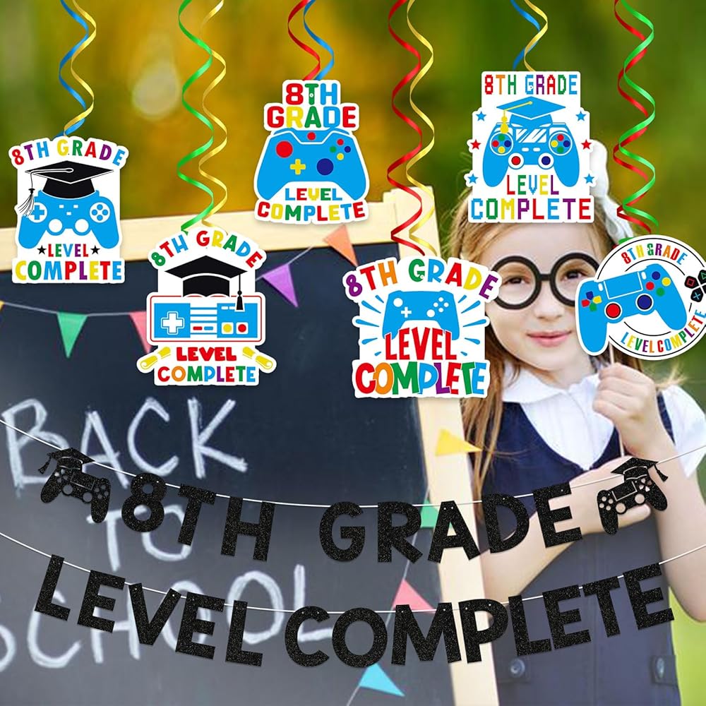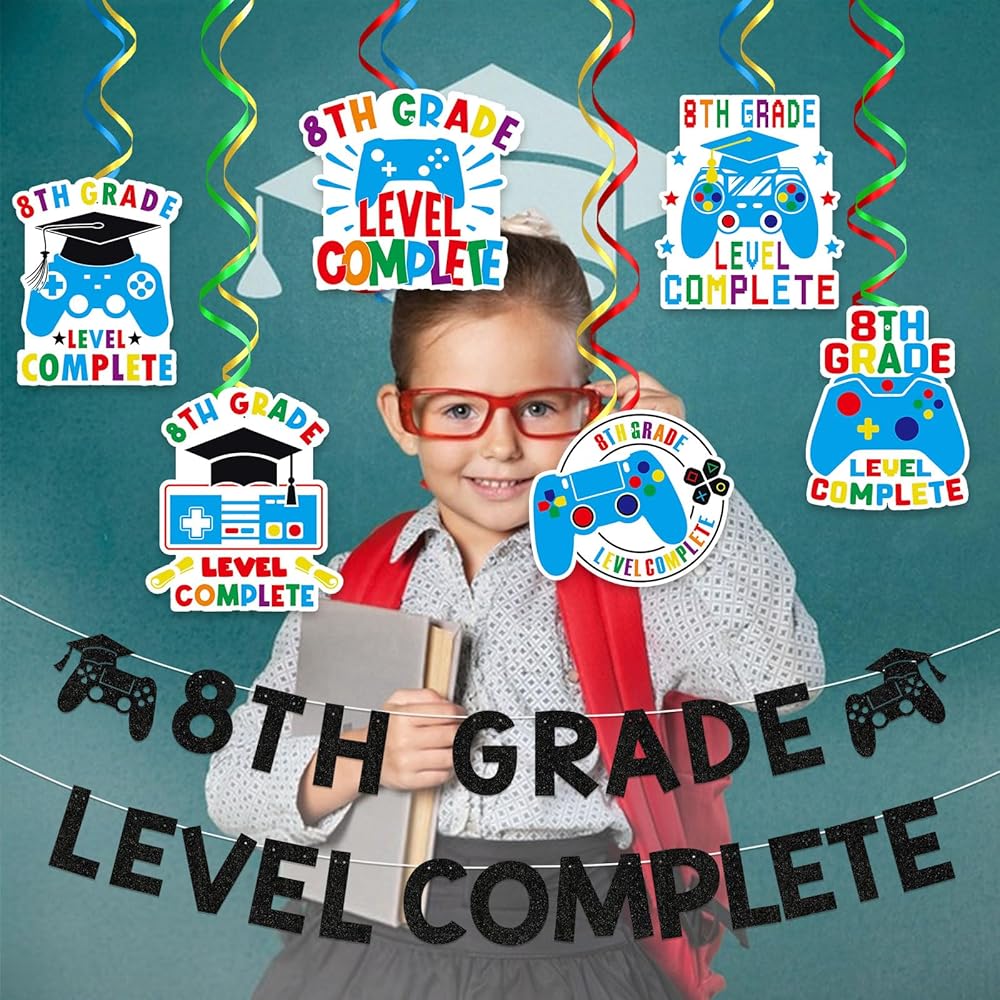 التصميم: لافتة كاملة لامعة ملونة من المستوى الثامن مثالية لديكورات التخرج من المدرسة المتوسطة لعام 2024 للاحتفال بديكورات الحفلات.