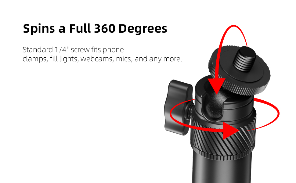 【توافق واسع】يوفر حامل الرأس الكروي المعدني متعدد الاستخدامات المرونة والثبات. تدور القاعدة 360 درجة، بينما يمكن تعديل رأس الكرة بحرية. تناسب الواجهة القياسية مقاس 1/4 بوصة الأجهزة المختلفة مثل كاميرات الويب والميكروفونات وأضواء السيلفي والكاميرات المدمجة والمزيد.