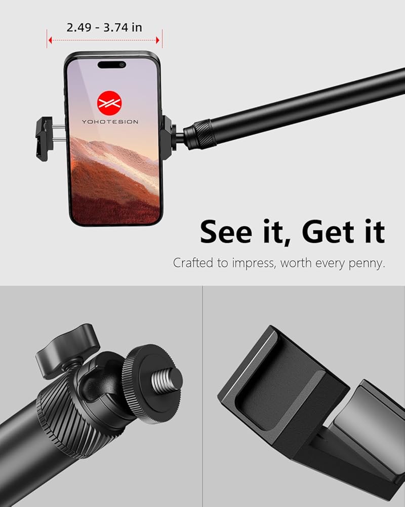 【مصنوع بشكل رائع، جودة عالية】حامل الهاتف هذا لتسجيل الفيديو مصنوع من سبائك الألومنيوم فائقة المتانة مع لمسة نهائية أنيقة مؤكسدة. يجسد التصميم الذكي البساطة الحديثة، دون التنازل عن الجودة.
