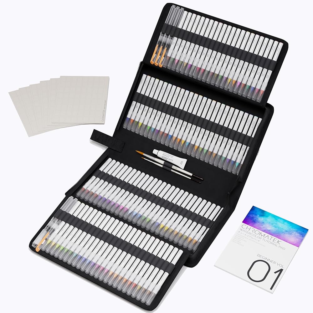 مجموعة أقلام الألوان المائية CHROMATEK 108 - لوحة مكونة من 15 صفحة وسلسلة دروس فيديو عبر الإنترنت - 5 Aquapens - 100 لون - لوازم فنية احترافية