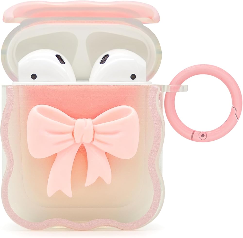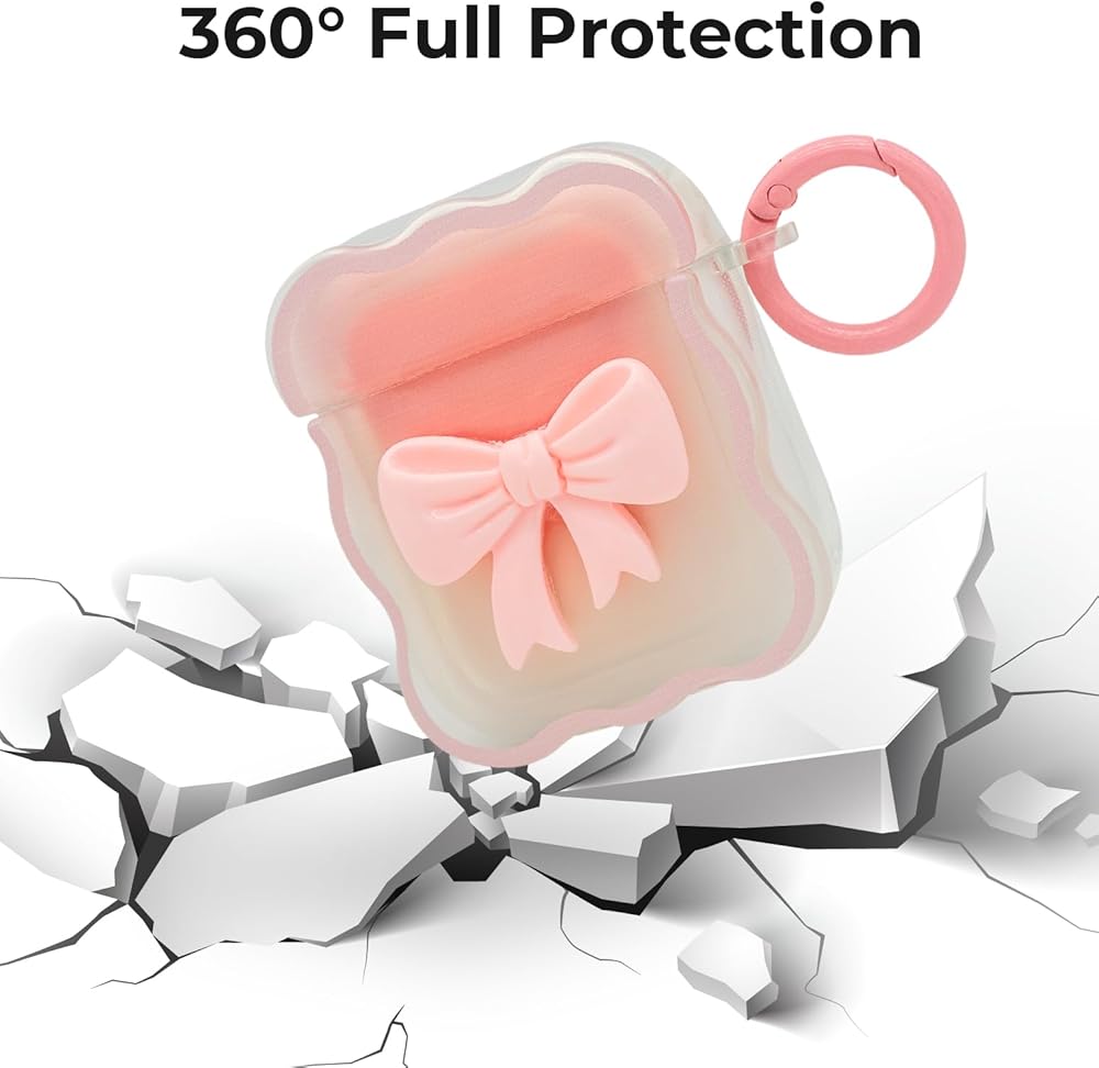 حافظة Airpods لطيفة، حافظة Airpods 2 ذات القوس الوردي، حافظة الجيل الأول من Airpods ثلاثية الأبعاد، Airpods الجيل الثاني مقاومة للصدمات، حافظة شحن من مادة TPU الناعمة الشفافة مع حلقة تسلق للفتيات والنساء