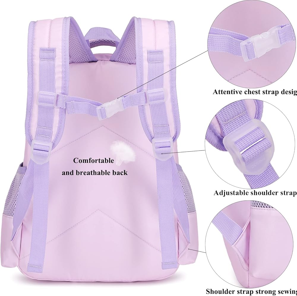 • حقيبة ظهر مناسبة للأطفال البنات: أحزمة الكتف والجزء الخلفي من حقيبة الكتب للفتيات هذه مبطنة، ويمكن لمشبك الصدر أن يوفر دعمًا إضافيًا، ويوزع وزن حقيبة الظهر، ويساعد على تجنب الألم ويمنح أطفالك شعورًا بالراحة عند الحمل، وأنت لن تقلق أبدًا من أنها ستسقط من أكتافه عندما يكون أطفالك في عجلة من أمرهم.