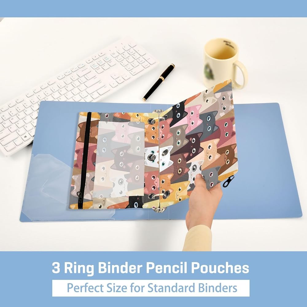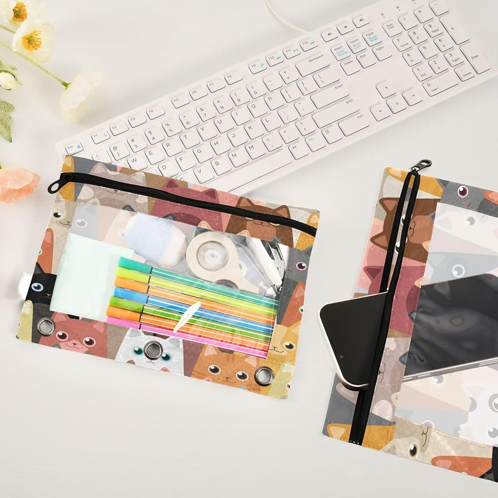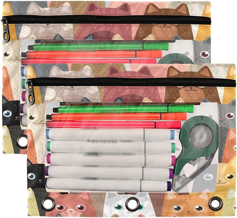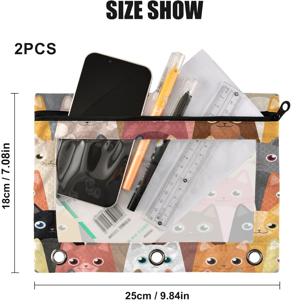 Cartoon Cats Pattern Pencil Pouch for 3 Ring Binder Pockets Clear Window Pencil Bag with Smooth Zipper Colorful Cats Pencil Case for Organization Office Supplies Cosmetics 2 Pack