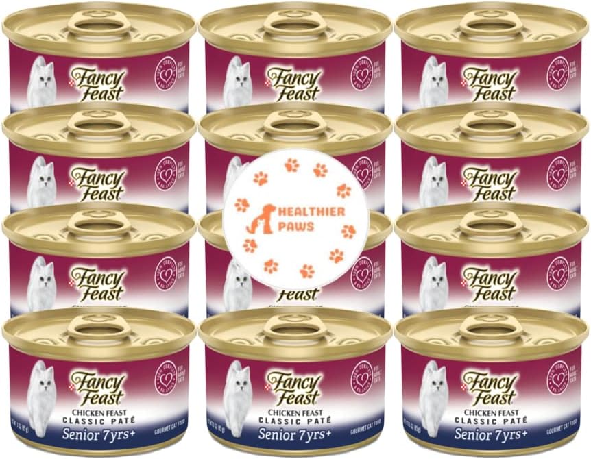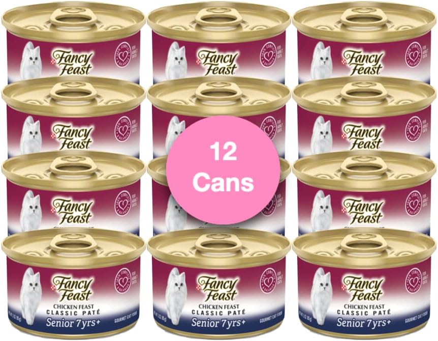 Support your senior cat's special nutritional needs by serving her selections from the Fancy Feast Senior 7+ adult wet cat food. This delicious chicken canned cat food recipe is specially formulated to meet your senior cat's unique nutritional needs and support her overall health. Each serving of this high protein cat food is formulated to provide 100% complete and balanced nutrition for adult cats age 7 and up while supporting her strong muscles. Antioxidants in our senior cat food recipe provide immune system support, while high levels of vitamin E nourish her skin and coat. Taurine, an essential amino acid for cats, helps maintain her clear vision. The meals come in convenient pull-tab cans that allow for easy feeding.