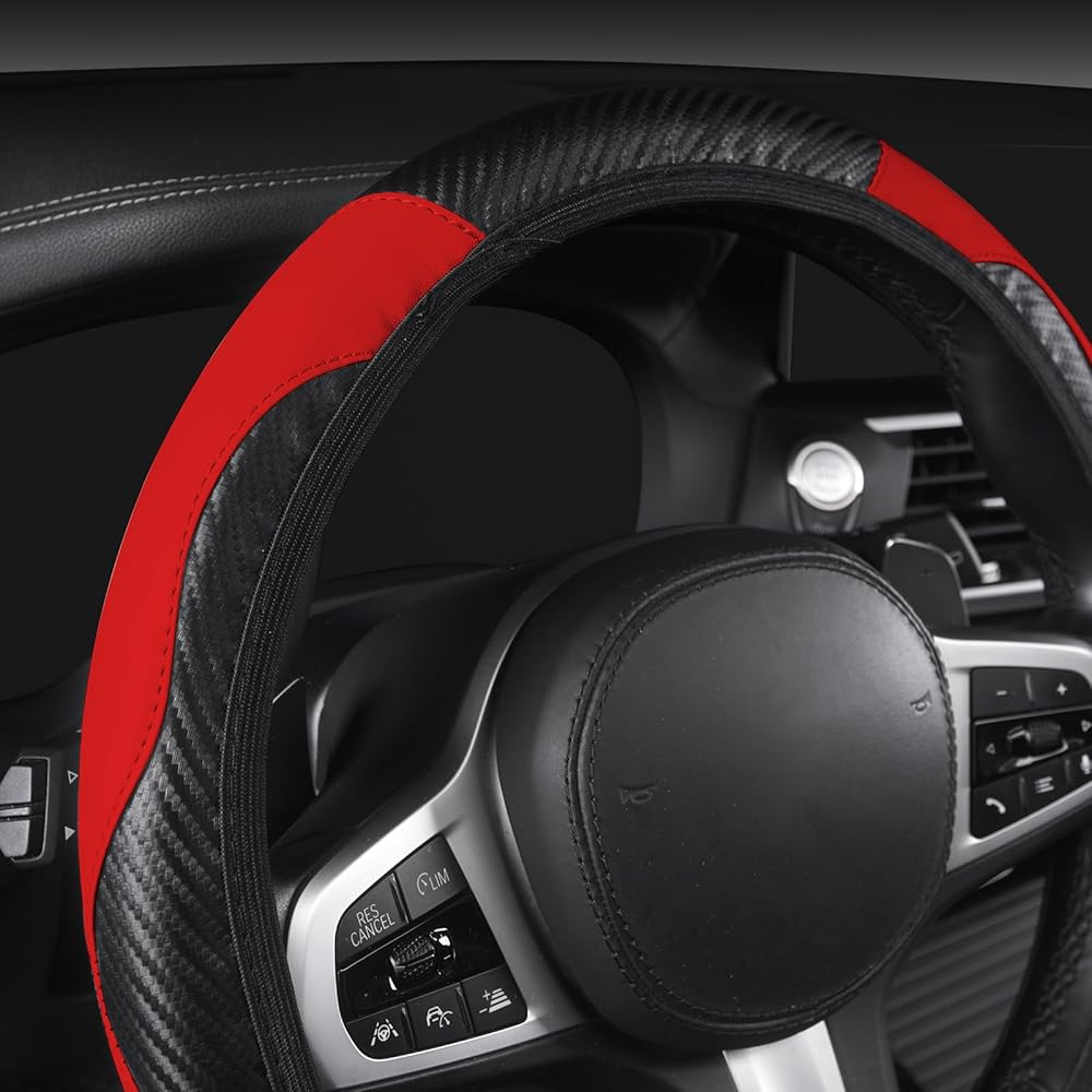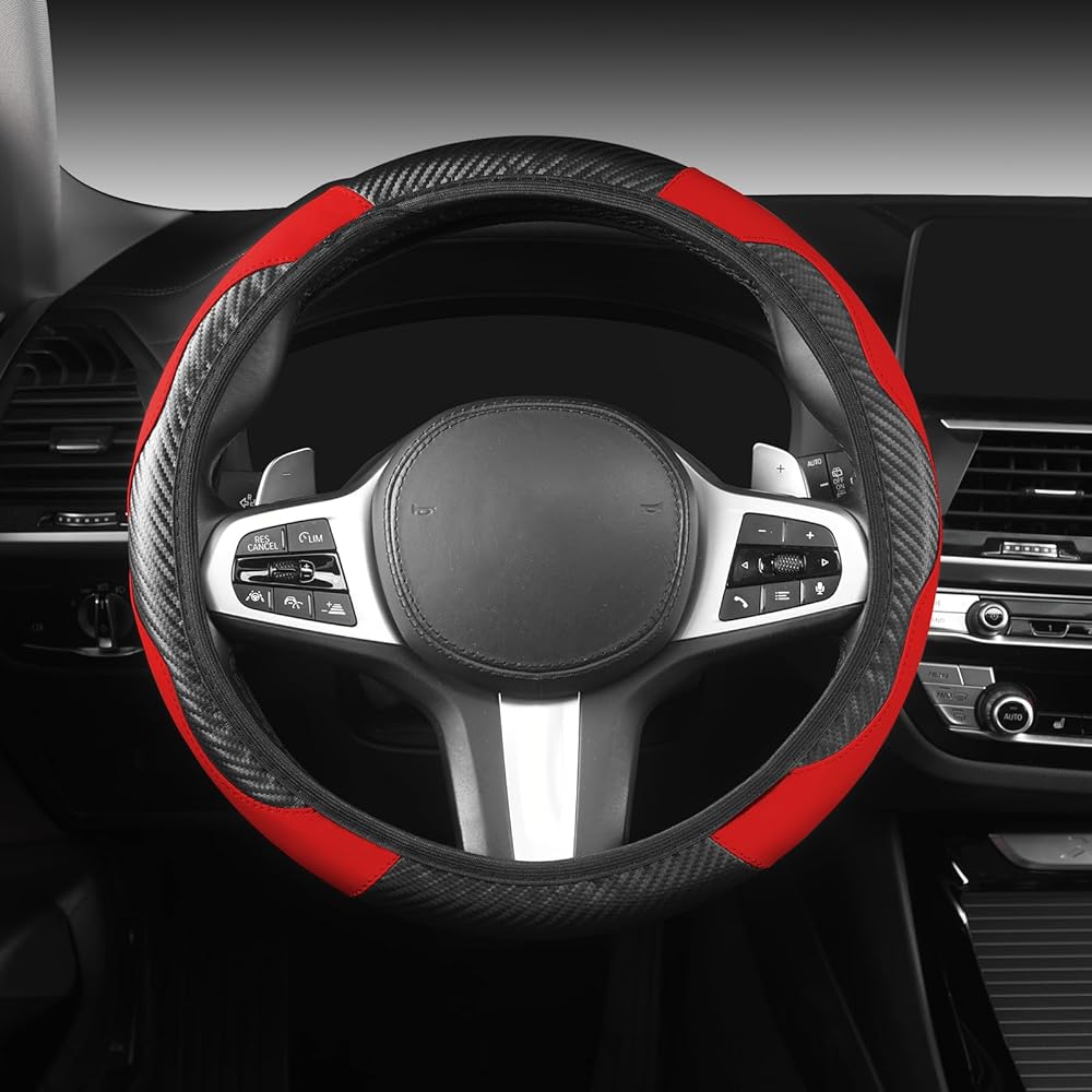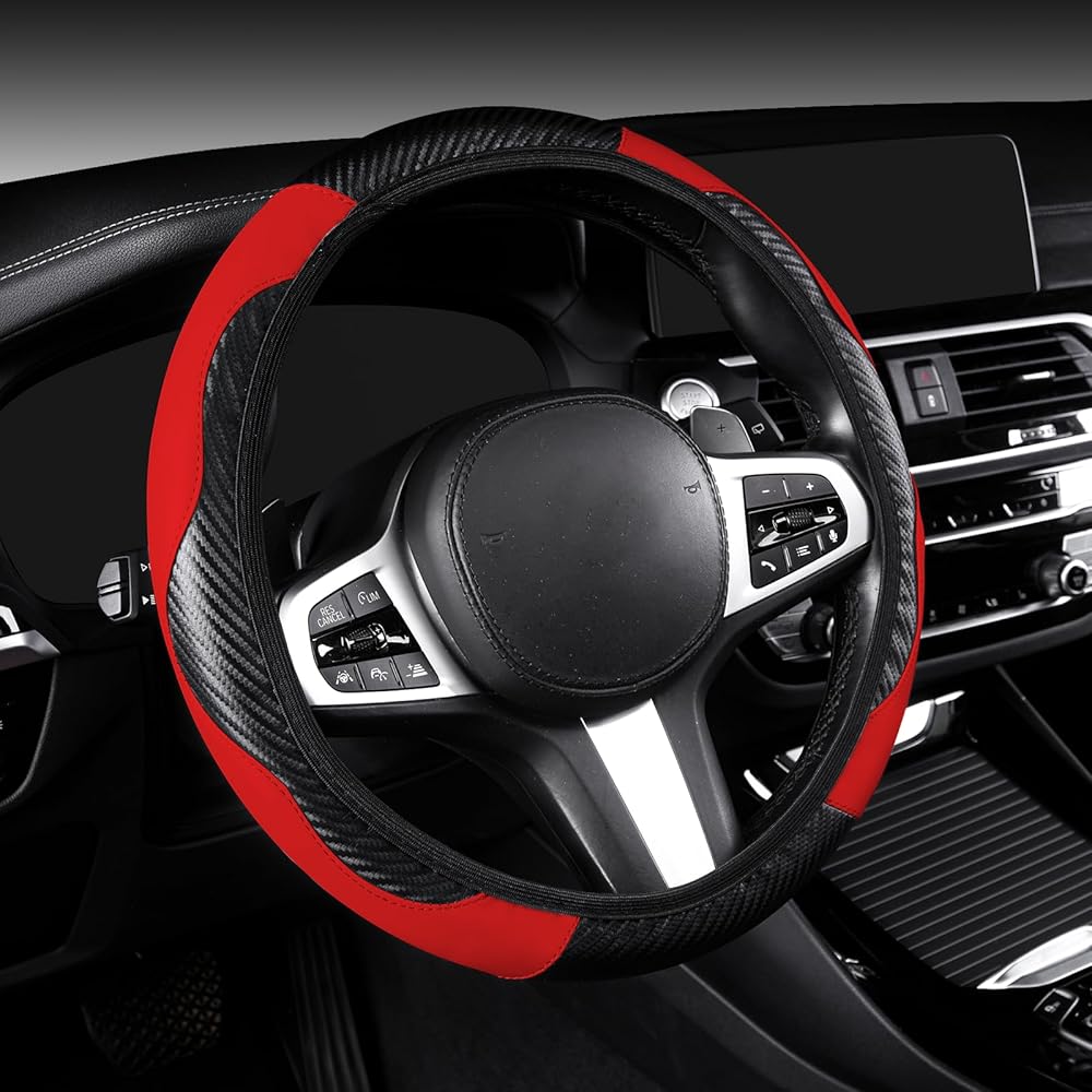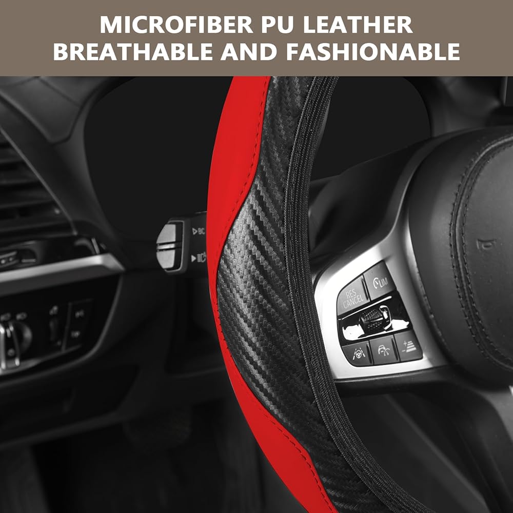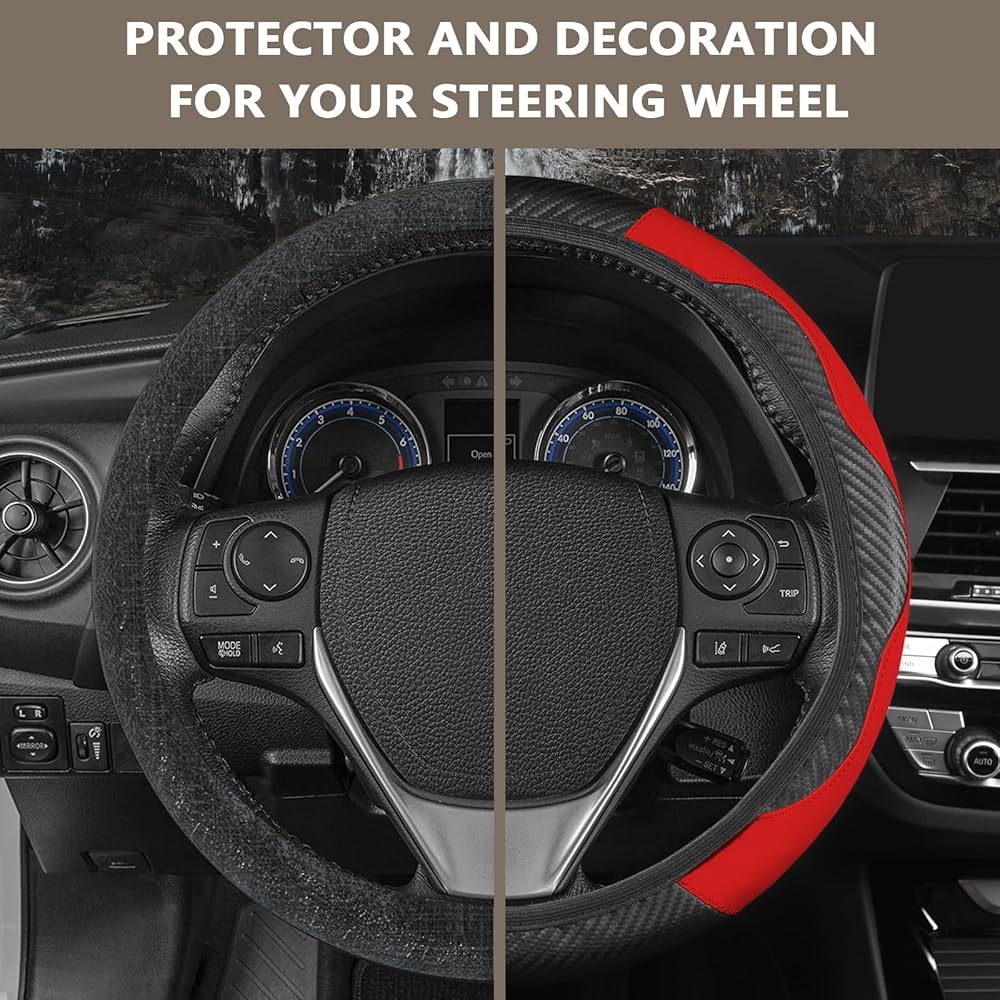 اللون والحماية: غطاء عجلة القيادة الجلدي العالمي مصنوع من جلد البولي يوريثان المصنوع من الألياف الدقيقة المتينة مع مادة غرز معززة، والتي يمكن أن تحمي عجلة القيادة الخاصة بك من التشقق والتقشير وحروق الشمس والخدوش والبهتان والتآكل والأوساخ. يعد واقي عجلة القيادة المتين خيارًا جيدًا لتغطية عجلات القيادة الأصلية القديمة أو البالية. يضيف تصميم الربط الدقيق نسيجًا إلى الجزء الداخلي من سيارتك ويحسن الشعور بالأناقة في سيارتك.