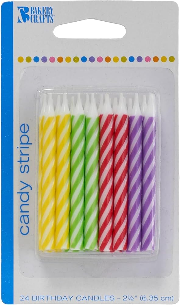 Bakery Crafts Candy Stripe Candles - Bright, Bold Candles in Yellow, Green, Red, and Purple. Great for a birthday celebration cake! ~Birthday Cake Candles - Decorate your cupcakes, cakes and bakes with these food safe bright birthday cake candles that are sure to add excitement to any birthday party or celebration.~2.5" Tall Candles - Perfect size for cupcakes and larger birthday cakes, each candle is 2.5"" tall making them perfect for birthday cakes and cupcakes. Just the right message for the special birthday cake. ~Long Lasting Pack - This candle set can be used for party after party. Each package contains 6 packs of candy stripe candles suitable for all occasions. ~Give Your Cakes a Professional Touch - The extensive Bakery Crafts range has everything you need to give your cakes that professional touch.