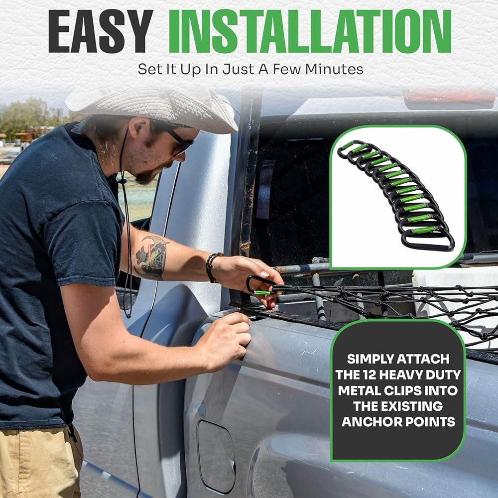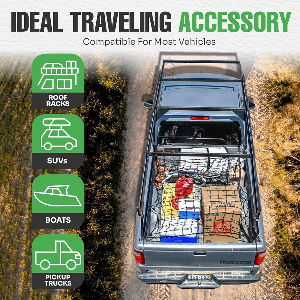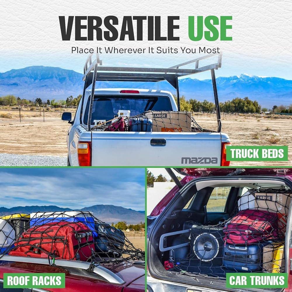 • ✓ تتوافق شبكة سرير الشاحنات هذه مع سيارات Ford وDodge RAM وChevy وToyota ومثالية لحاملات البضائع على السطح ورفوف الأمتعة للشاحنات والمقطورات والالتقاط وسيارات الجيب وسيارات الدفع الرباعي وGMC وATV/UTV والقوارب أو أي حمولة كبيرة الحجم.