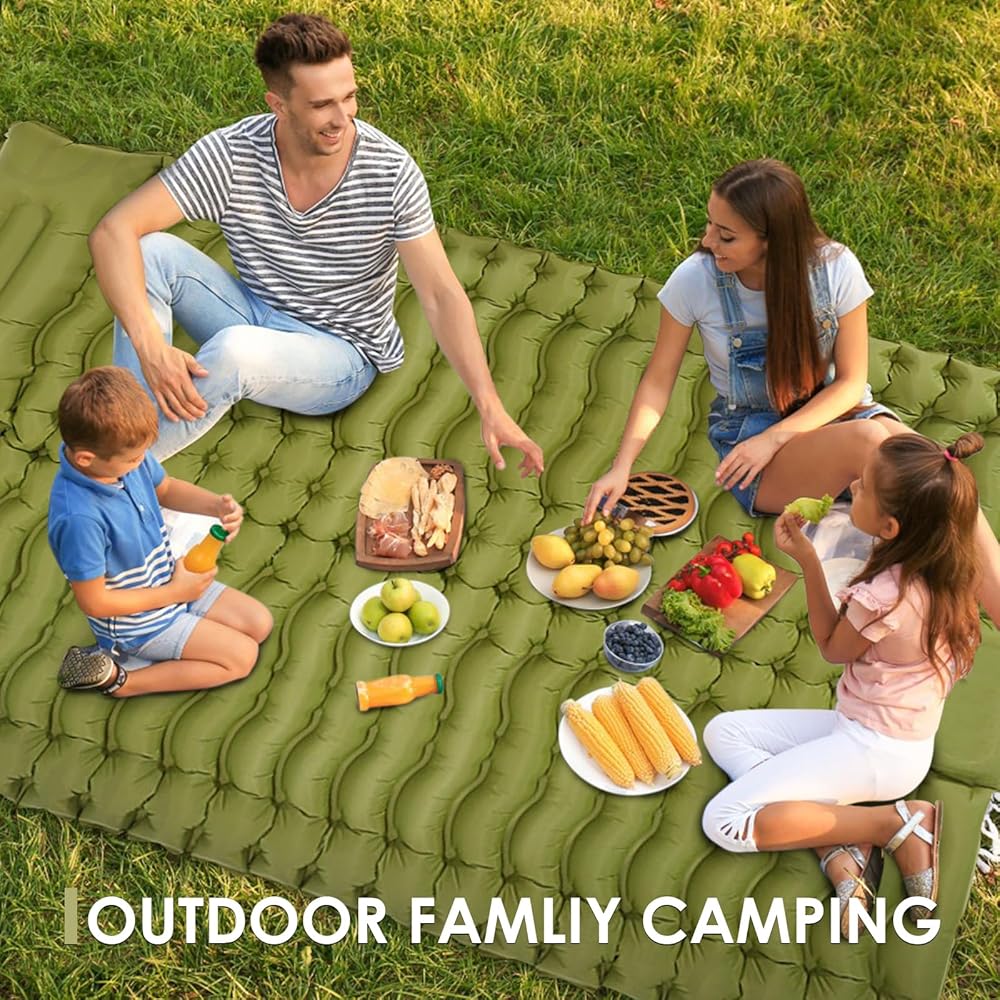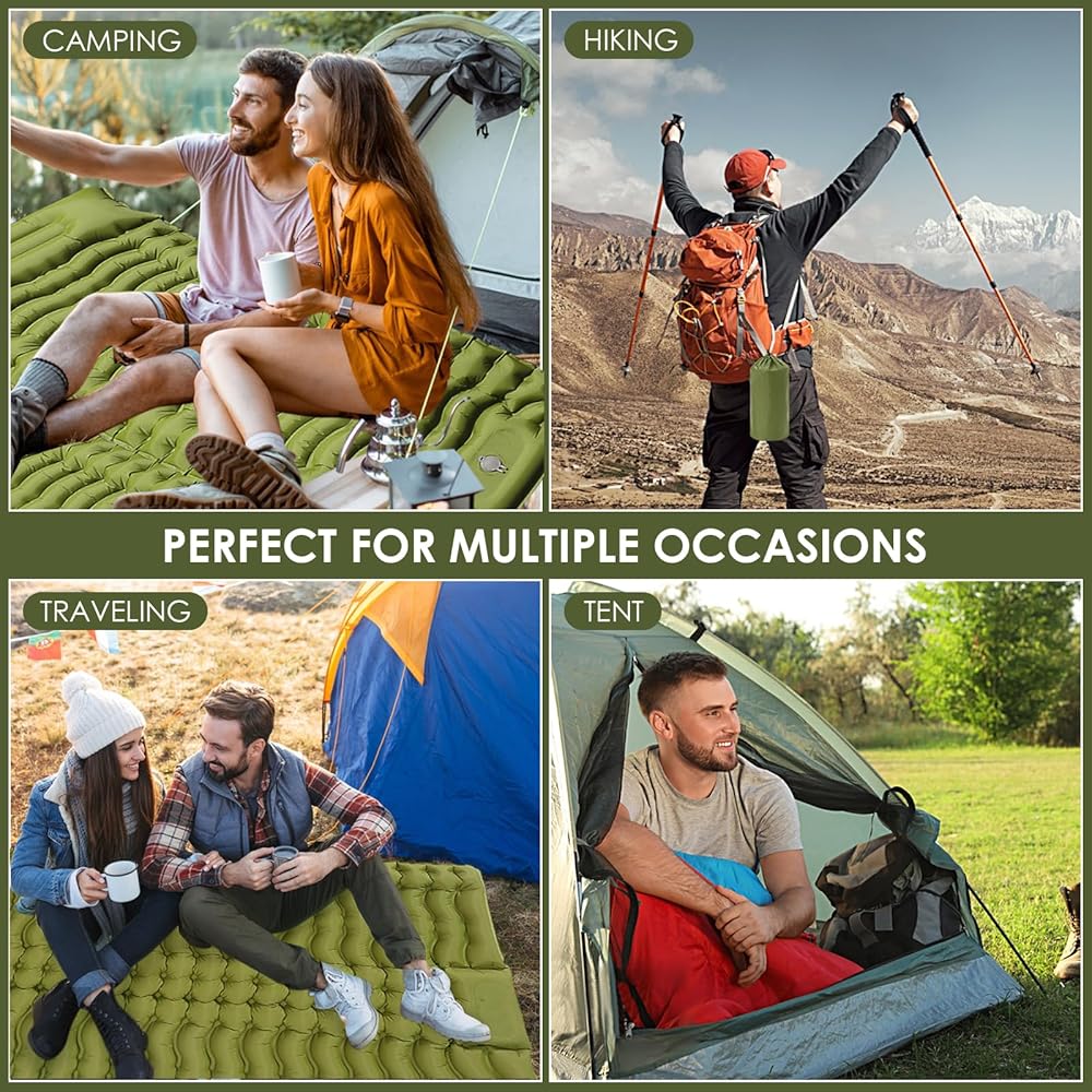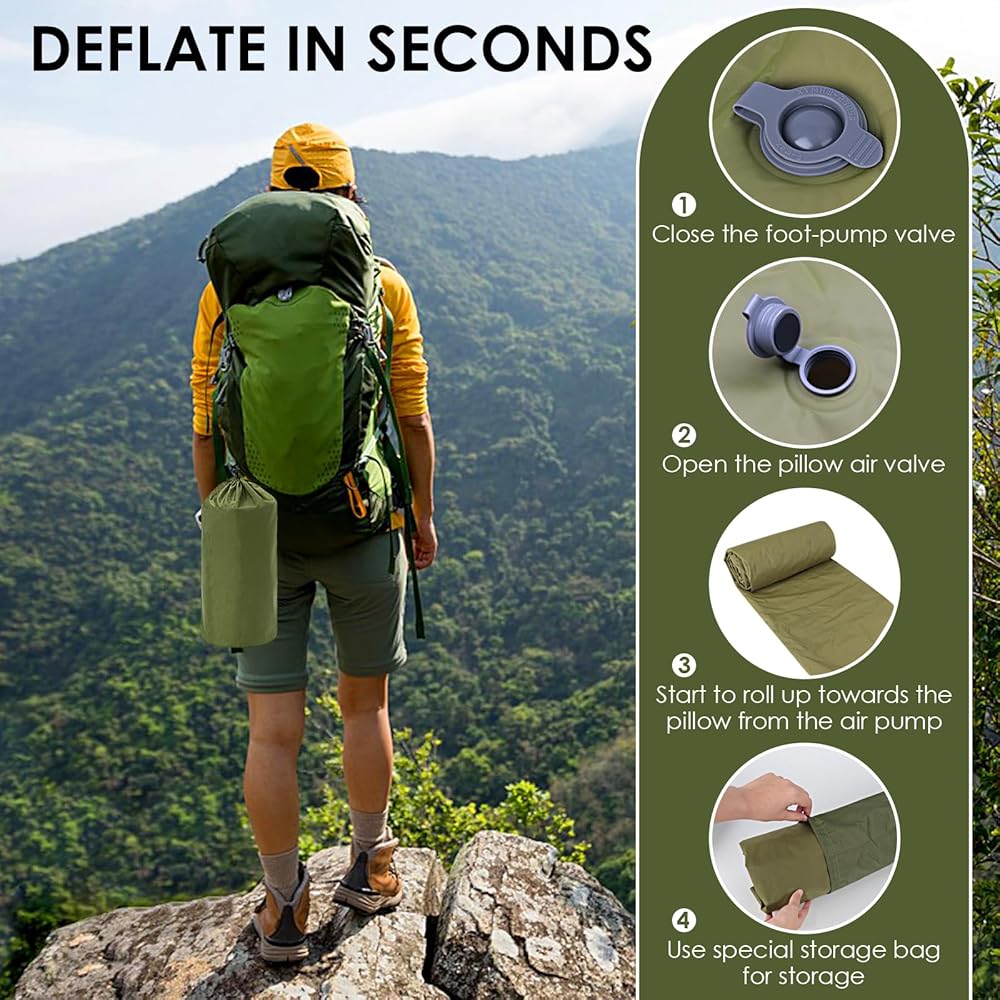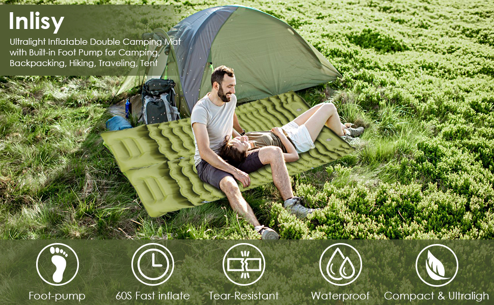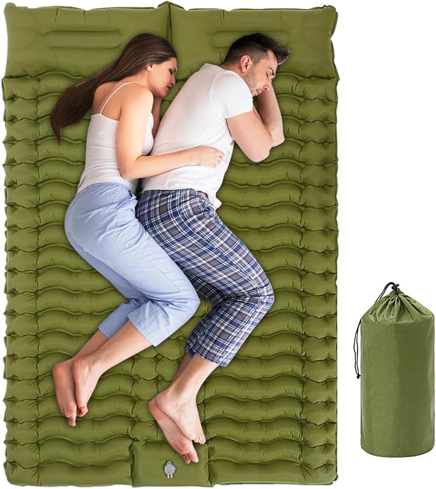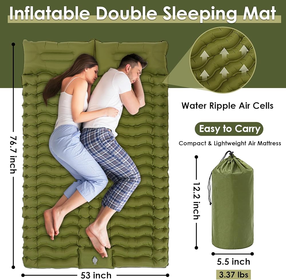 سجادة نوم مزدوجة قابلة للنفخ: وسادة نوم مزدوجة ذاتية النفخ خفيفة الوزن تزن 3.37 كجم فقط، بعد النفخ الحجم: 75 طول × 51 عرض × 3.2 ارتفاع، حجم مفرغ ومطوي: 5.5 طول × 12.2 ارتفاع فقط. يمكن وضعها بسهولة في حقيبة الظهر ويمكن أخذها إلى أي مكان. مثالية للمشي لمسافات طويلة والتخييم وحقائب الظهر والتسلق والرحلات وغيرها من الأنشطة الخارجية.