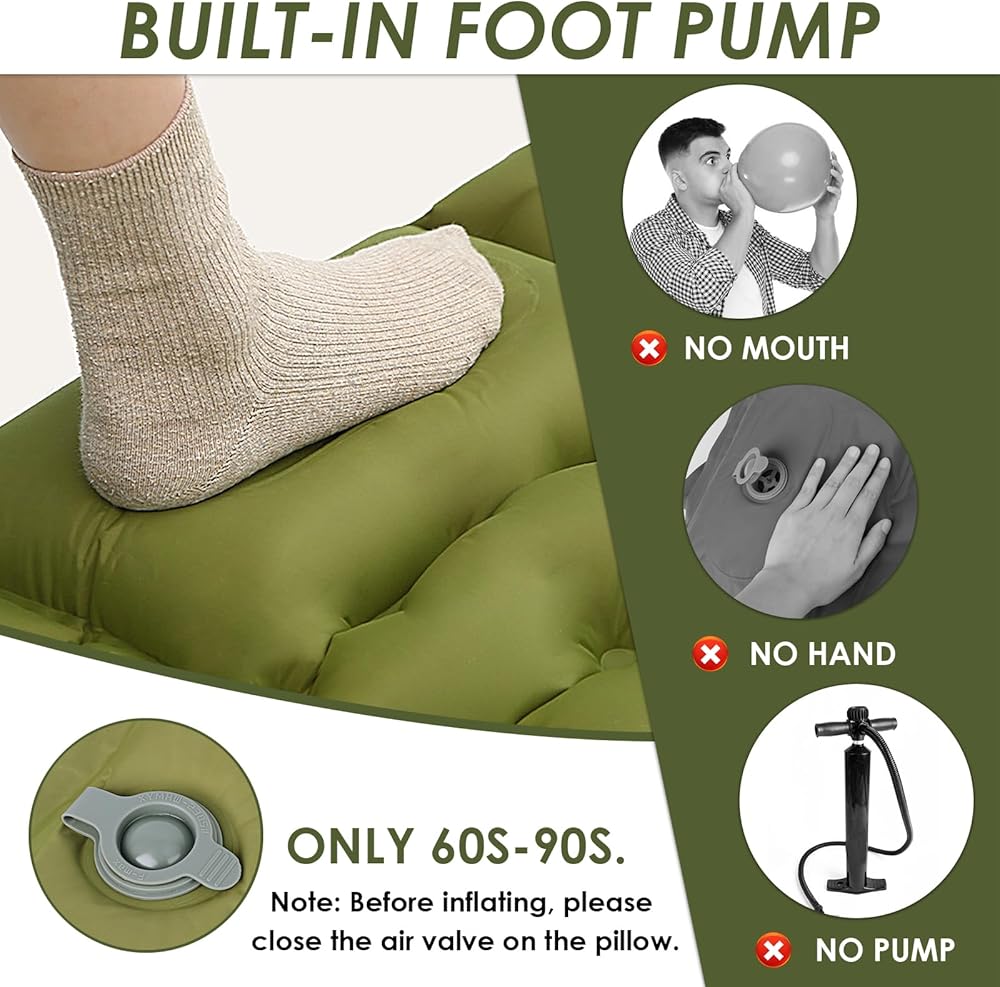 النفخ بالقدم: يتميز بتصميم مبتكر لمضخة القدم، يمكنك نفخ وسادة التخييم بسهولة عن طريق الوقوف عليها. لا مزيد من المعاناة مع فمك أو يديك أو مضخة الحمل! تحتوي على مضخة قدم مدمجة تسمح لك بنفخها بالقدم في 30S-60S. ما عليك سوى فتح صمام الانكماش وسوف يفرغ في ثوانٍ. اضبط صلابة وسادات النوم عن طريق إضافة أو إطلاق الهواء حسب تفضيلاتك.
