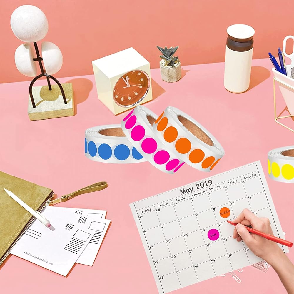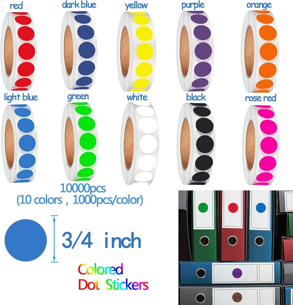 • 【ألوان وكمية كافية: 】 تأتي مع 10000 قطعة من ملصقات نقاط الألوان مقاس 3/4 بوصة، 10 ألوان (الأحمر الوردي، الأخضر، الأصفر، الأزرق الفاتح، الأحمر، الأسود، الأبيض، الأرجواني، البرتقالي، الأزرق الداكن؛ 1000 قطعة لكل لون)، تحتوي ملصقاتنا المرمزة بالألوان على ألوان وكمية وفيرة لمتطلباتك.