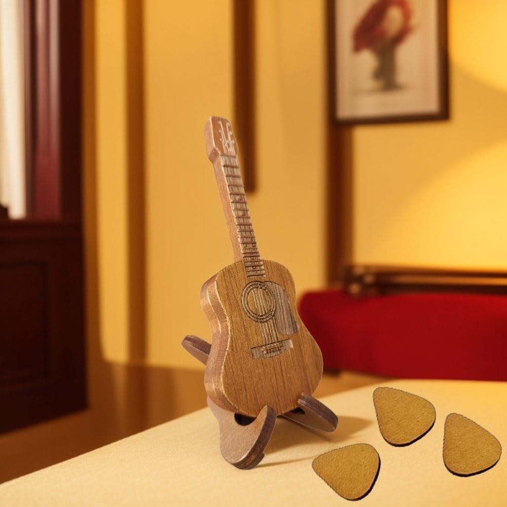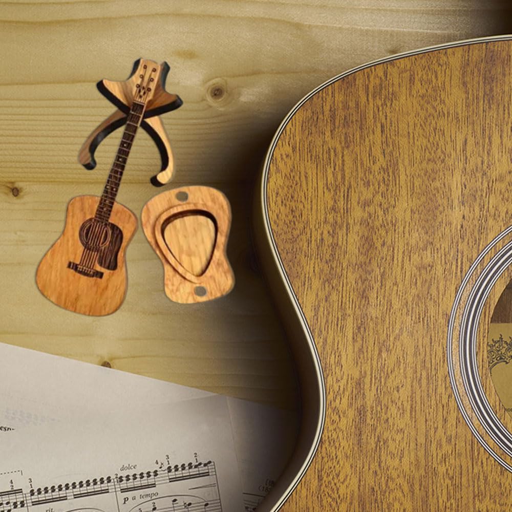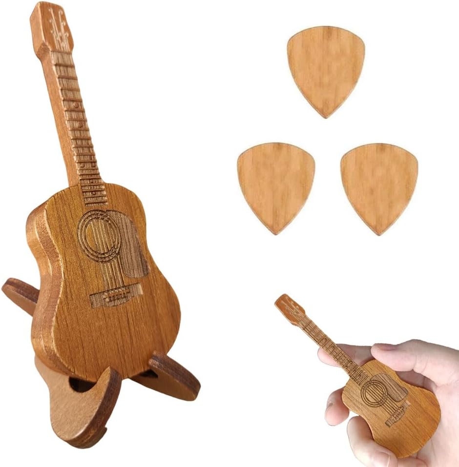 Wooden Guitar Pick Box with Stand, Mini Guitar Shaped Pick Holder with 3PCS Guitar Picks, Engraved Guitar Pick Holder, Guitar Pick Case for Guitar Bass Player Lovers