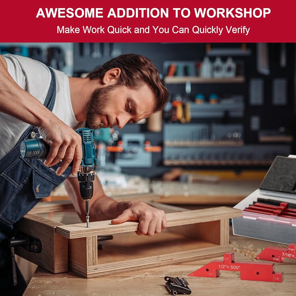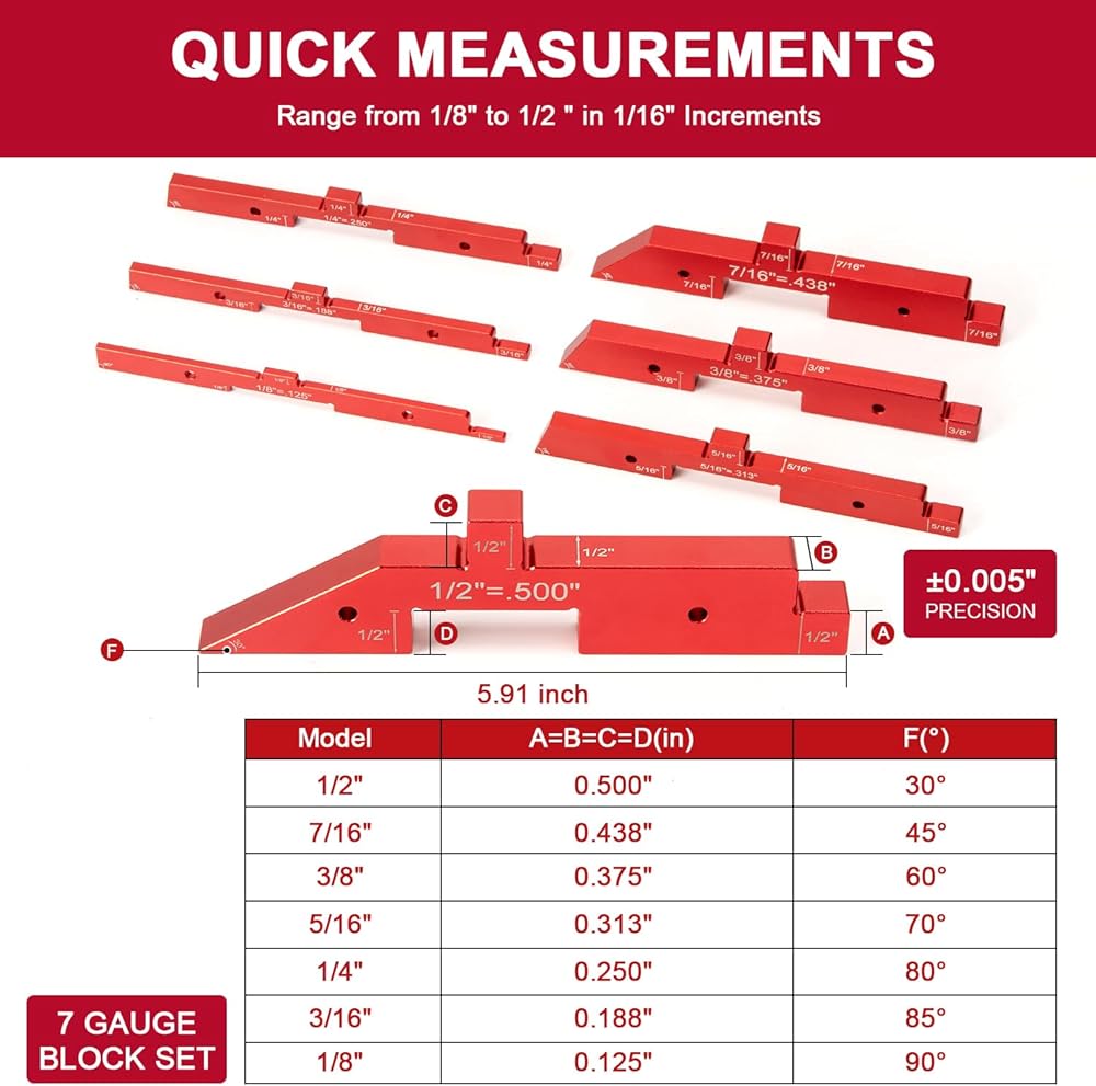 GREAT BAR GAUGE WOODWORKING SIZE - 7pcs 5.91 inch setup blocks with different thicknesses, depth and angles, 1/8", 3/16", 1/4", 5/16", 3/8", 7/16", 1/2" with 90°, 85°, 80°, 70°, 60°, 45°and 30° angle measuring ends (Accuracy ± 0.005"). Come in a plastic case with slots foam padding for protecting and storage, laying on your work bench for quick grab access and help you to turn out great work in a short time.