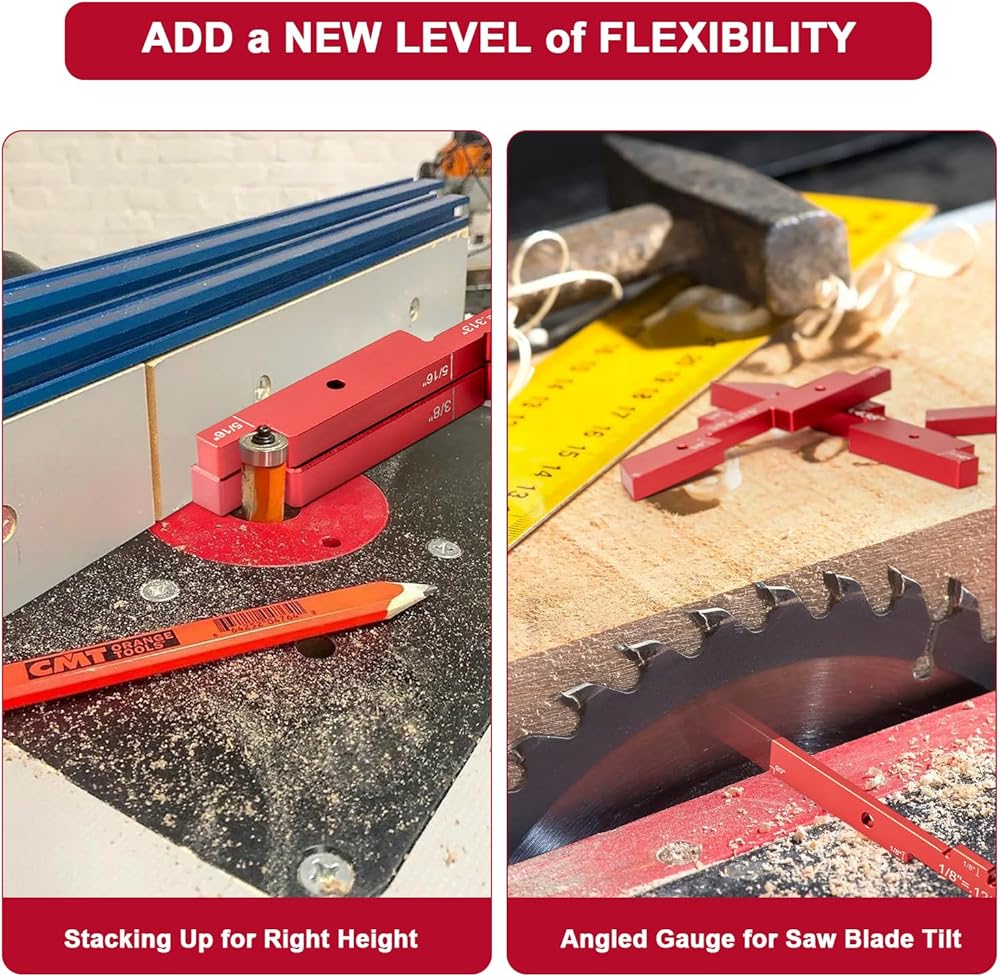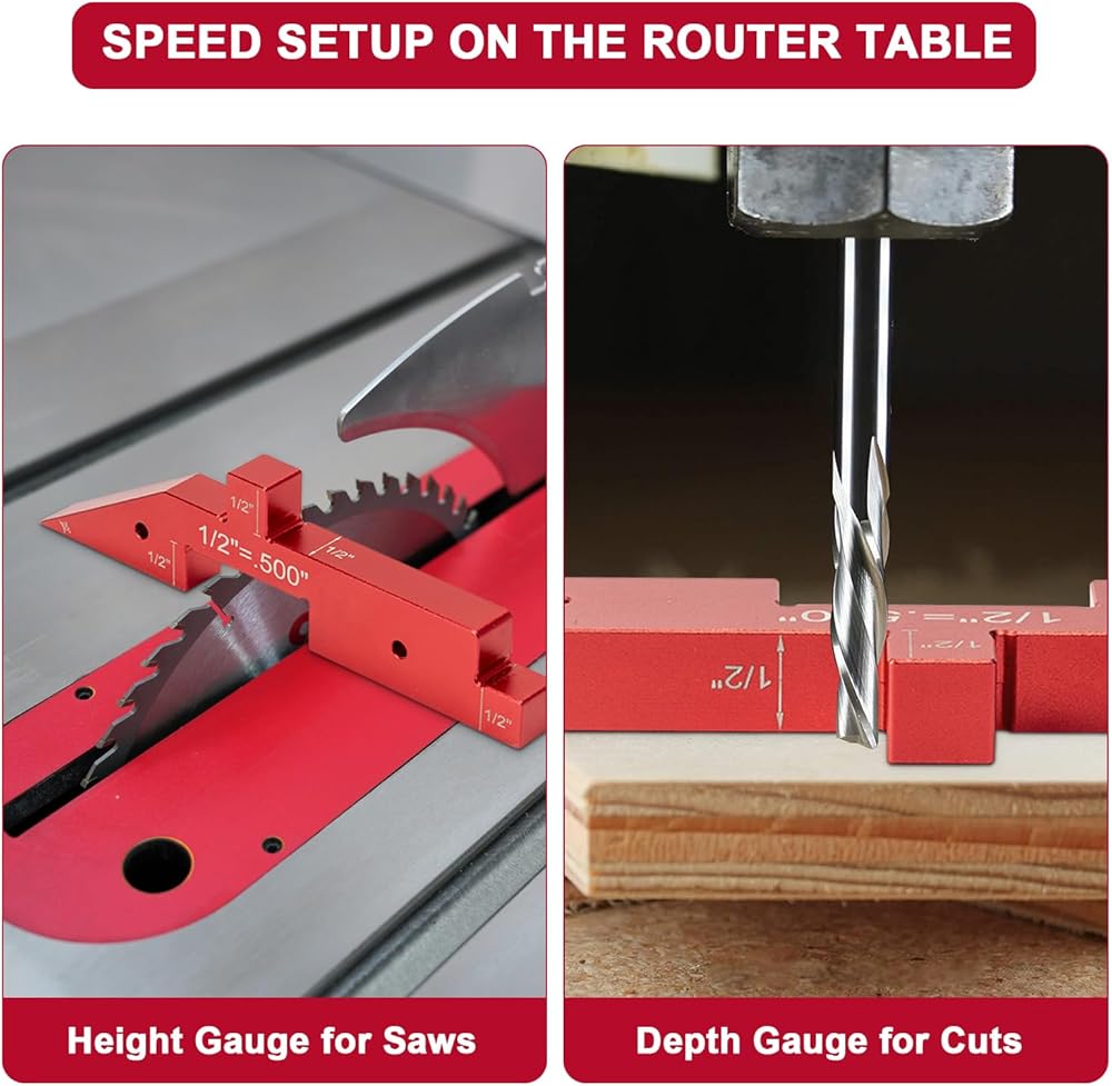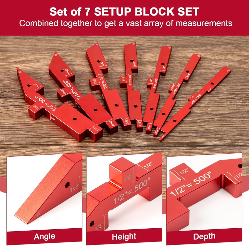 SET ROUTER TABLE SETUP BARS APPLICATION - These aluminum precision setup blocks work as a height gauge for saws and router bits, a depth gauge for dados, a thickness gauge for between a table saw blade and the fence and a angled gauge for saw blade tilt etc. The woodworking setup bars also perfect for bandsaw, tongue and groove bits etc. A must have and an gift for woodworker and DIYer. Note that they're machined about ± 0.001" and the wood expands and contracts with temp and humidity.