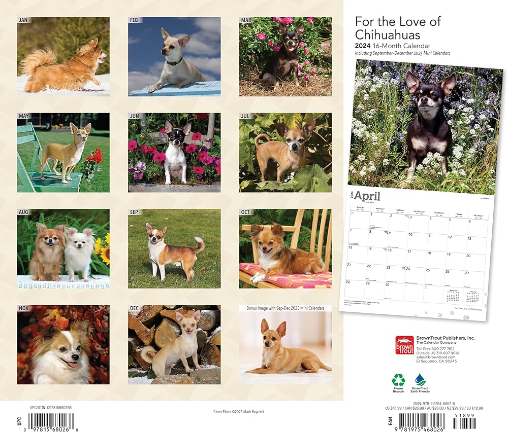 Step into 2024 with the sassy and small sensations, the Chihuahuas! Each page reveals their feisty personalities and tiny statures. Embrace the year with pocket-sized powerhouses making a big impression! Deluxe Chihuahuas 2024 Wall Calendar Bundle with Separately Licensed Calendar Stickers. This 2024 Chihuahuas calendar is printed on premium heavyweight deluxe paper. Large grids to mark appointments and events. Observes major holidays and moon phases. This Chihuahuas 2024 wall calendar measures 12 x 12 inches closed and 12 x 24 inches opened. Includes an individually wrapped pack of separately licensed Dateworks calendar stickers. Over 100 calendar stickers to mark school events, doctor appointments, dates, vacations and more! This 12 x 12 inch calendar features an opening spread with a beautiful four month (September-December 2023) calendar to plan the last four months of the year and prepare for 2024. A year of stunning Chihuahuas images. Officially licensed Chihuahuas merchandise. Perfect as Chihuahuas gifts, office supplies and desk accessories.