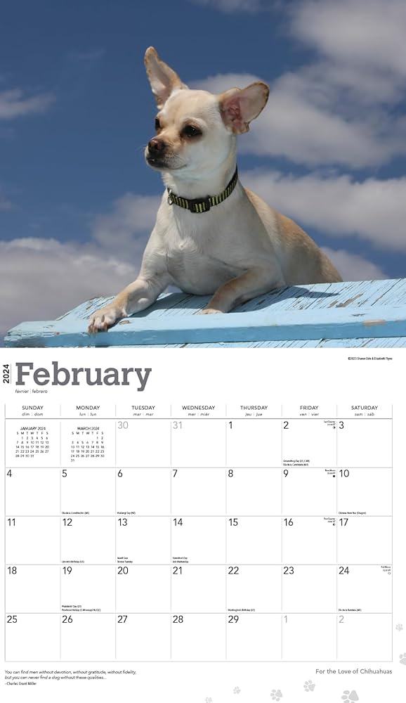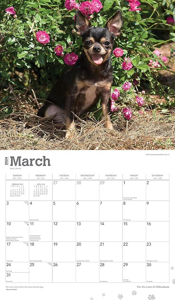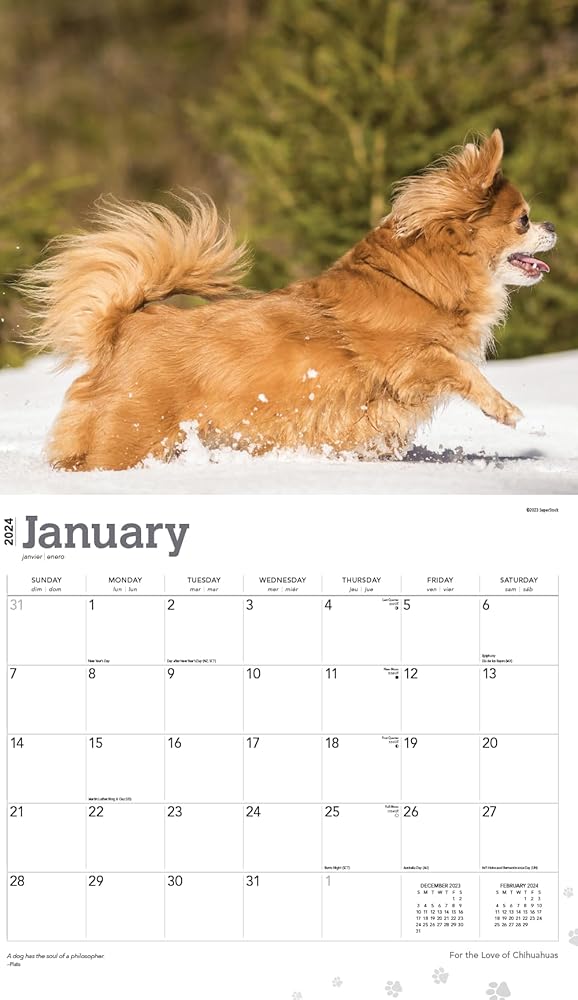 This 2024 Chihuahuas calendar is printed on premium heavyweight deluxe paper. Large grids to mark appointments and events. Observes major holidays and moon phases. This Chihuahuas 2024 wall calendar measures 12 x 12 inches closed and 12 x 24 inches opened.