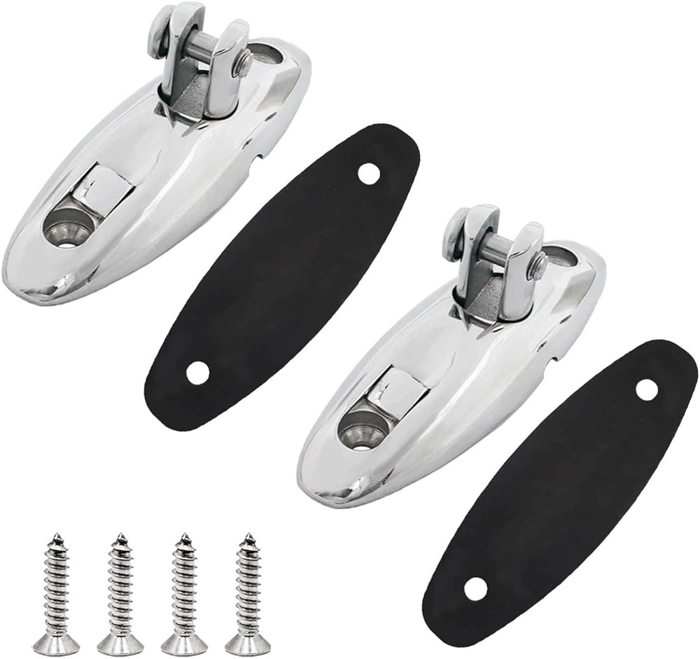 YANYU 2 Pcs Bimini Top Quick Release Deck Hinge 316 Stainless Steel Boat Side Mount Swivel Hinge with Screws and Rubber Gasket Material : 316 stainless steel Surface : Mirror polished Length : 3.6 inches (92mm) ; Width :1.2 inches (30.6mm) ; Height : 1.33 inches (34mm) ; Mounting hole to mounting hole: 2.5 inches (63.5mm) Package Includes: Bimini Top Quick Release Deck Hinge X 2 4.8x25mm Mounting Screws(SS316) X 4 Rubber Gasket X 1