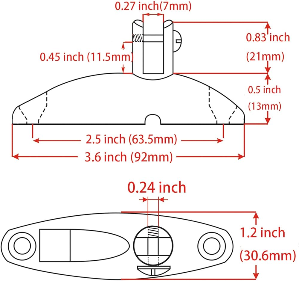 • Bimini top Quick Release Deck hinge,Length : 3.6"(92mm) ; Width :1.2"(30.6mm) ; Height : 1.33"(34mm) ; mounting hole to mounting hole: 2.5”(63.5mm).