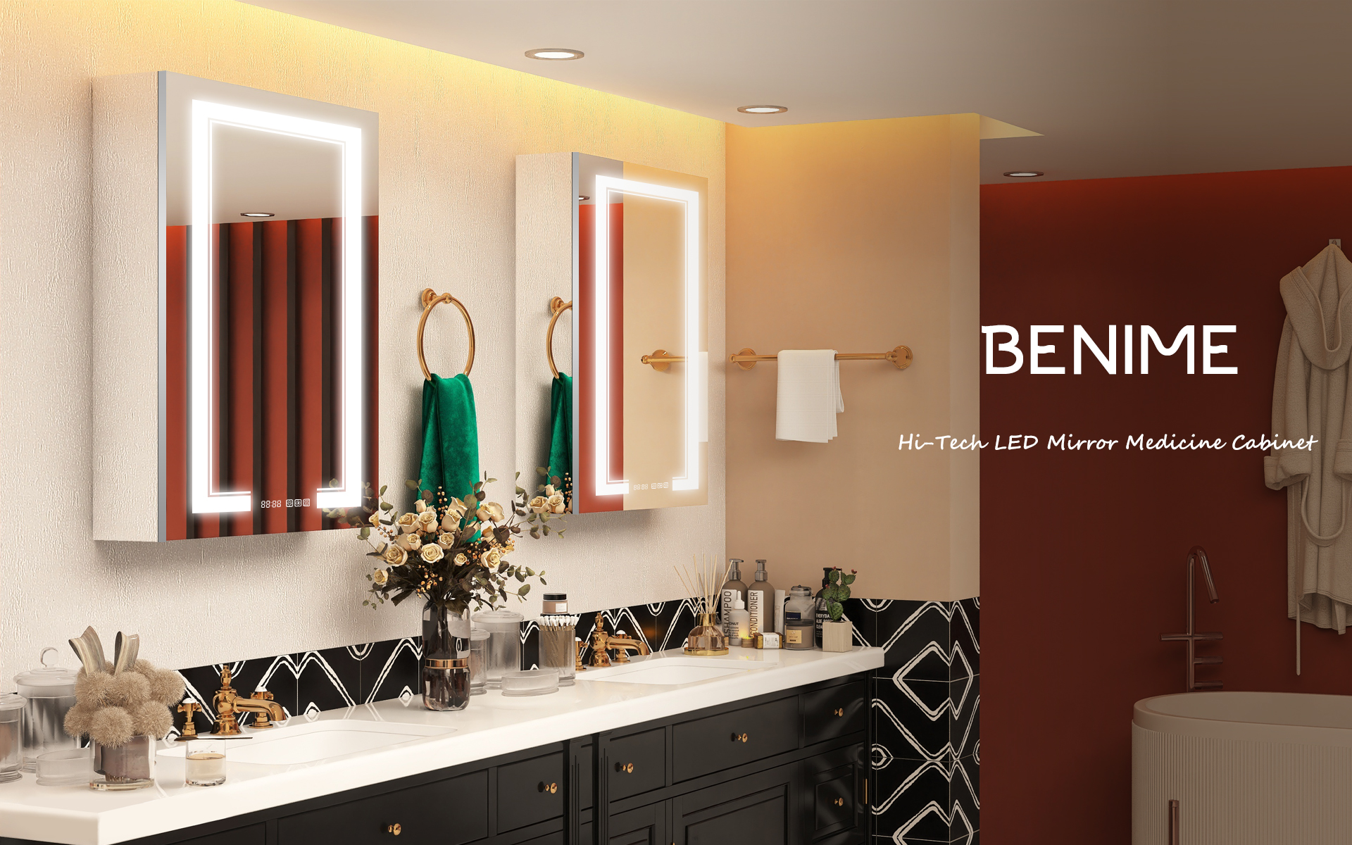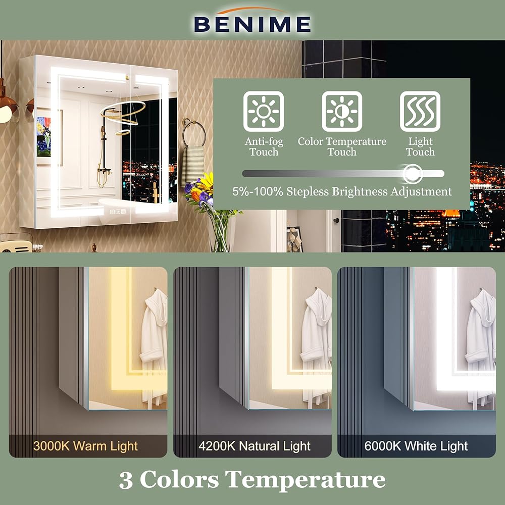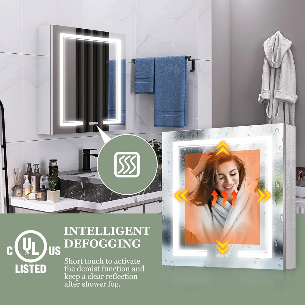 ❤️[مزيل الضباب والسطوع والألوان بدون خطوات] تحتوي خزانة أدوية الحمام المعتمدة من ETL المزودة بمرآة LED على مزيل ضباب لتنظيف المرآة الضبابية بعد الاستحمام. تحتوي المرآة عالية الدقة 3.0 الخالية من النحاس على 240 مصباحًا لكل متر/15 وات، مما يجعلها أكثر سطوعًا من خزانة الأدوية المضيئة الأخرى. اضغط لفترة طويلة لضبط السطوع من 5% إلى 100% لتلبية الاحتياجات المختلفة، لمسة قصيرة لتحديد درجة حرارة اللون 3000 ك، 4200 ك أو 6000 ك للمكياج أو الحلاقة. ميزات التكنولوجيا العالية تجعلها خزانة طبية مثالية بمرآة LED.