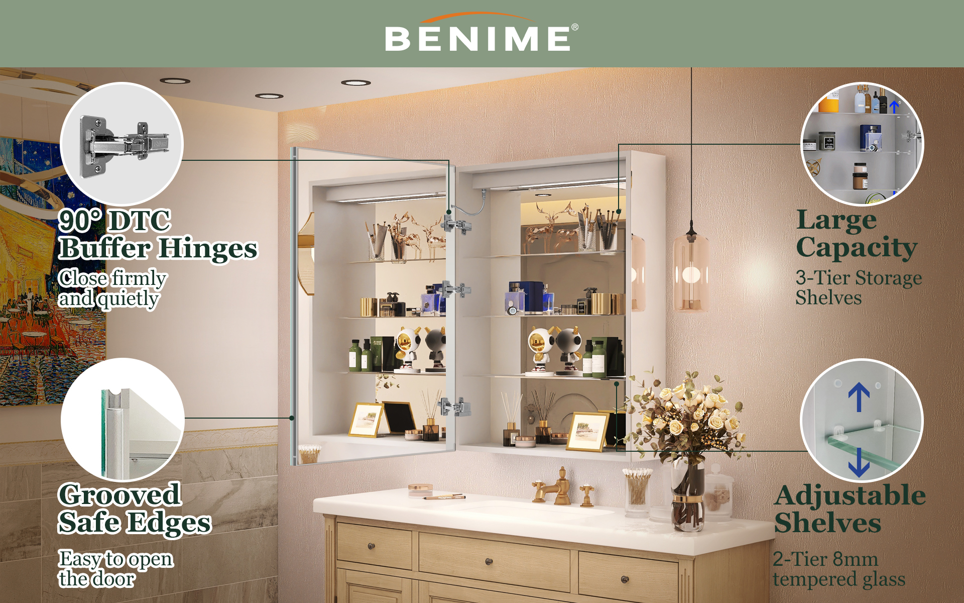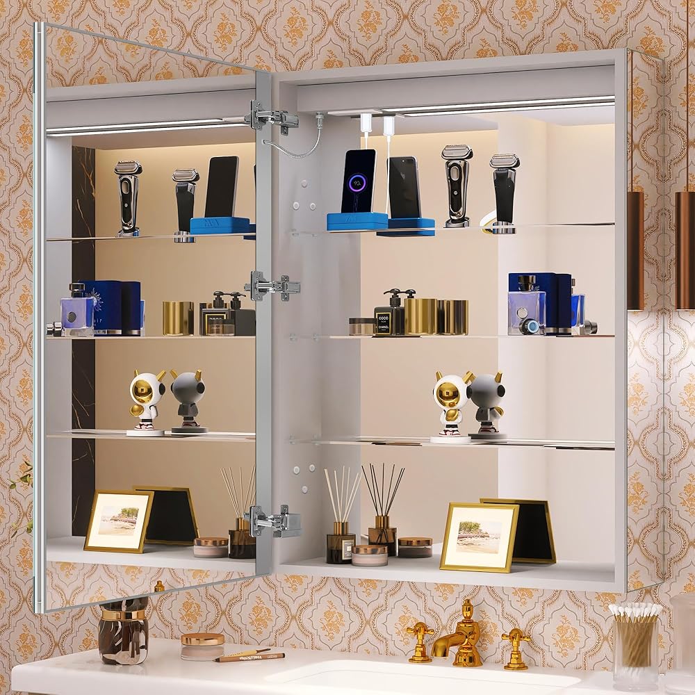 ❤️[تخزين خزانات الأدوية بمرآة LED] تم تصميم خزانة الأدوية المضيئة بمرآة LED وباب مرآة مزدوج الجوانب يحتوي على هيكل خزانة من سبائك الألومنيوم المضاد للصدأ وهيكل باب ثابت، ومفصلات عازلة ناعمة وهادئة بزاوية 110 درجة DTC، أداة تعتيم غير متدرجة، 3 مصابيح ملونة، إضاءة تلقائية داخلية، 3 طبقات تخزين وطبقتين قابلتين للتعديل، 2 مرآتين جانبيتين، 2 منافذ ومنافذ USB، تركيب غائر أو سطحي. يتميز بطبقة نهائية مقاومة للخدش، وحواف باب محززة للاستخدام الآمن.