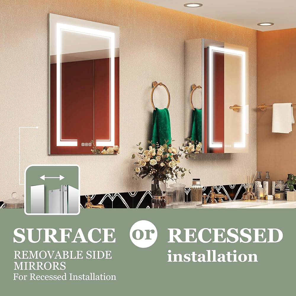 ❤️[تركيب مجوف وسطحي] تحتوي خزانة الأدوية ذات المرآة ذات السعة الكبيرة على 3 أرفف تخزين و2 رفوف داخلية مقواة قابلة للتعديل بسمك 8 مم لتلبية احتياجات الارتفاع المناسبة. تدعم خزانة الأدوية LED التثبيت السطحي ثنائي الاتجاه مباشرة على الحائط أو تثبيته في الحائط. تأتي مع مرآتين جانبيتين قابلتين للإزالة لتركيب خزانة الأدوية المجوفة، مع الحفاظ على مسافة بارزة تبلغ حوالي 1 بوصة سيكون من السهل فتحها وإغلاقها.