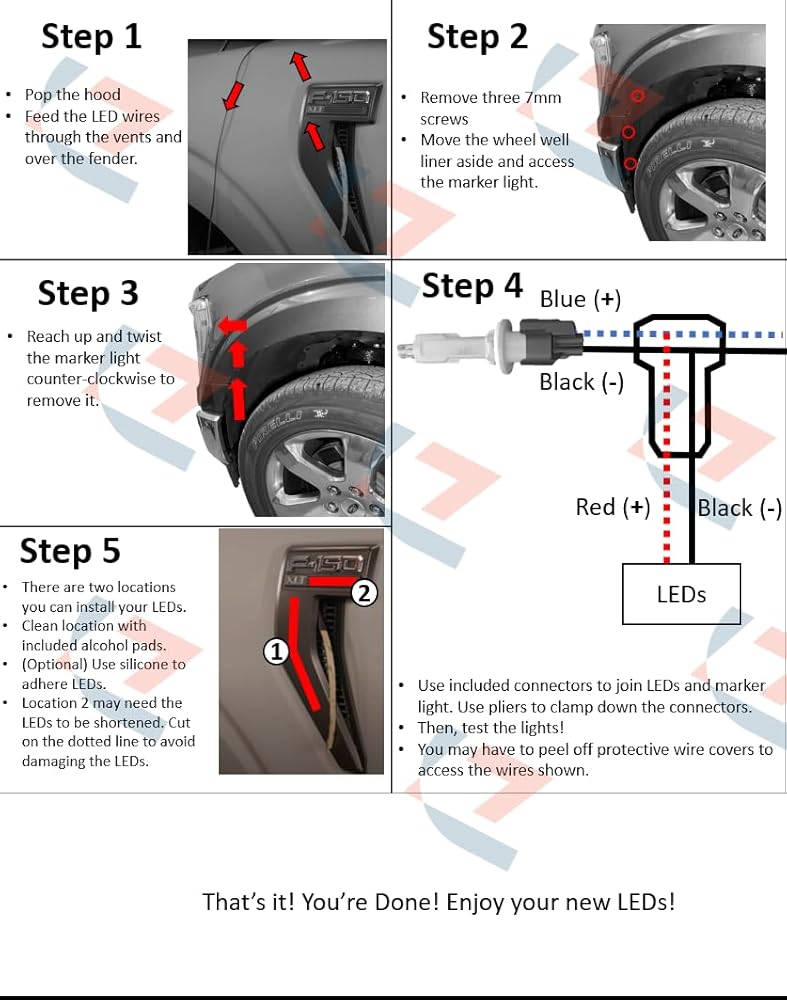 What's Included: All hardware for both passenger and driver side installation: Detailed instructions, LED Lights, All necessary wiring, all necessary connectors, adhesive, silicone, alcohol prep pads.